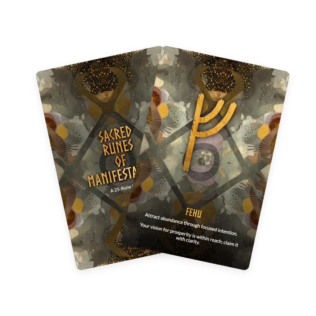 The Sacred Runes of Manifestation is a meticulously crafted 25-card deck designed to deepen your spiritual practice and enhance your manifesting abilities. Each rune within the deck serves as a gateway to ancient wisdom, offering precise guidance and clarity to help you navigate your path with confidence. By engaging with these sacred symbols, you can align your intentions clearly and activate the energies needed to bring your desires into reality.
