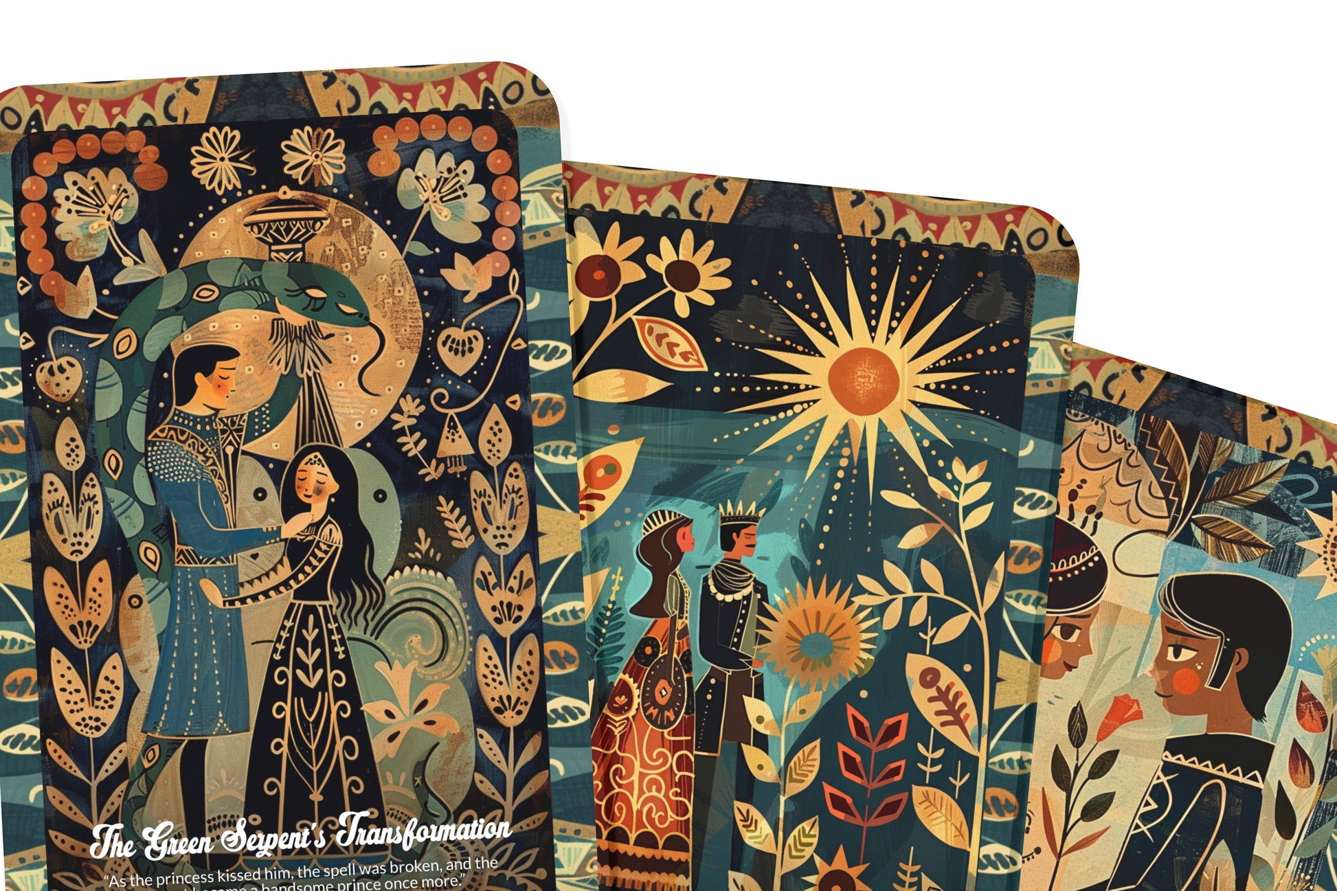 A beautiful princess is cursed by a jealous sorceress and transformed into a green serpent. A prince, hearing of her plight, vows to break the curse. He undertakes dangerous quests to prove his love, and eventually, his devotion and bravery break the curse, returning the princess to her human form. The story illustrates themes of true love, sacrifice, and perseverance. It teaches that love, when pure and true, can overcome even the most difficult obstacles and that bravery is often required to reveal the beauty hidden within.