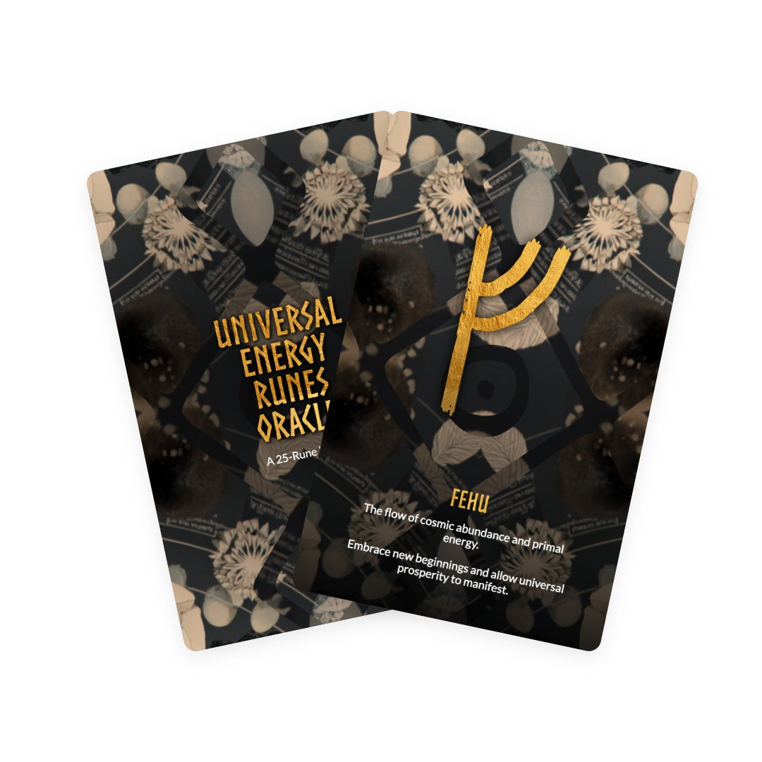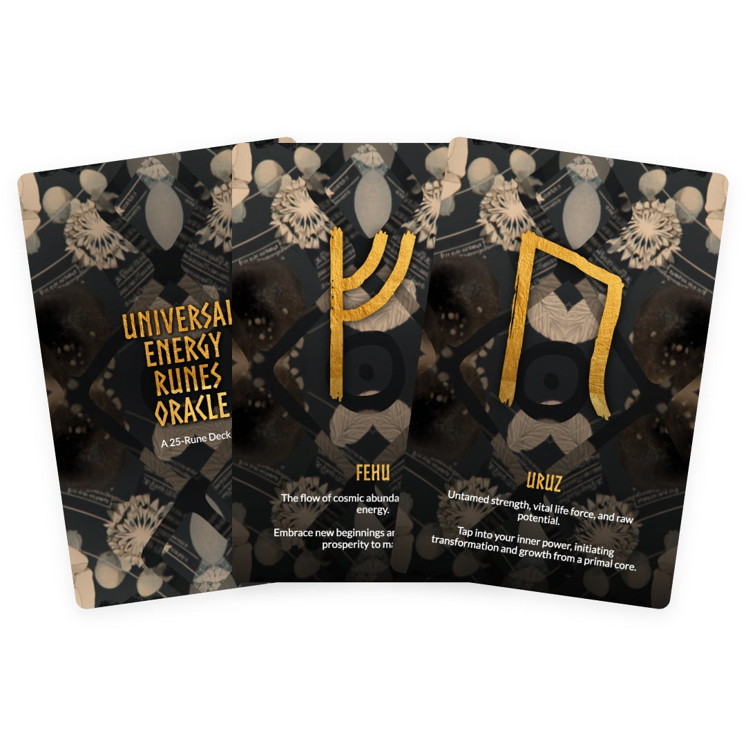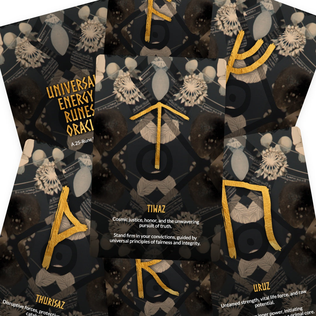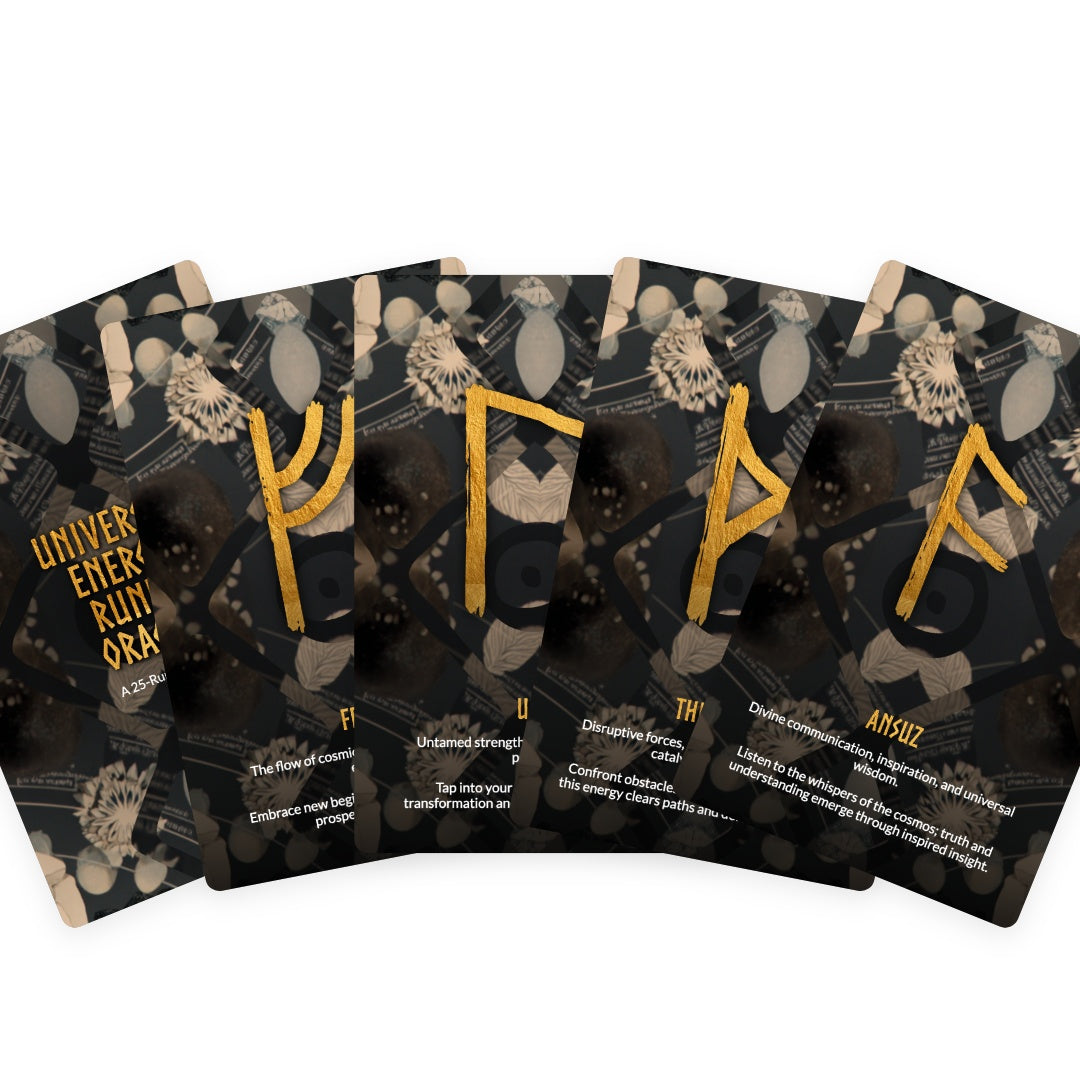 The Universal Energy Runes Oracle Deck invites you to explore timeless wisdom and harness cosmic energies for deeper spiritual connection. Comprising 25 meticulously designed rune cards, each symbol serves as a powerful channel to universal energy, enabling you to access profound insights and clarity.