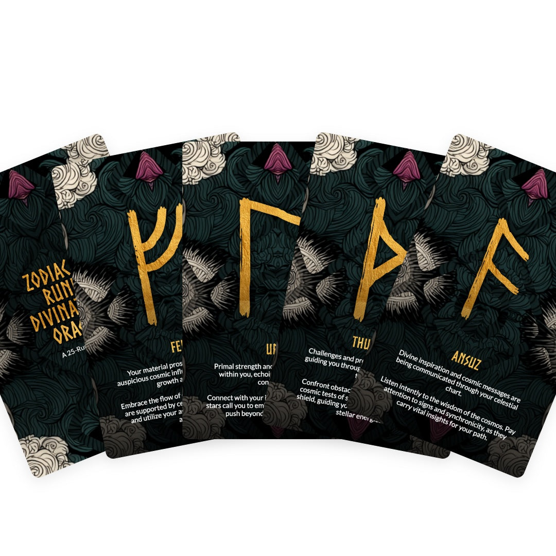 The Zodiacal Rune Divination Deck is a thoughtfully crafted 25-card set that integrates the timeless language of runes with the cosmic energy of the zodiac signs. Each card invites you to delve deeply into the intricate relationship between astrological influences and rune symbolism, offering nuanced interpretations that reveal hidden patterns and spiritual guidance.