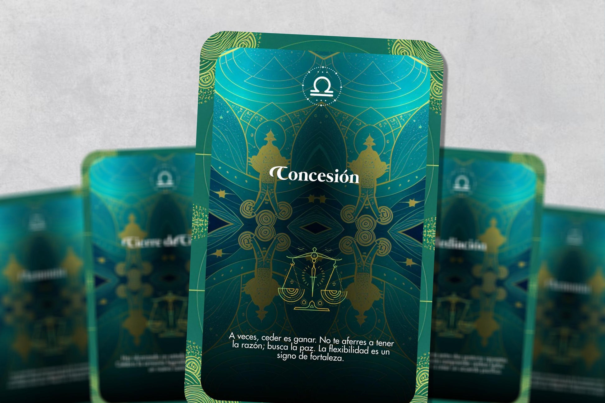 Cada carta presenta un título único y un mensaje personal que refleja los rasgos y fortalezas de Libra, como la armonía, la justicia y la colaboración.