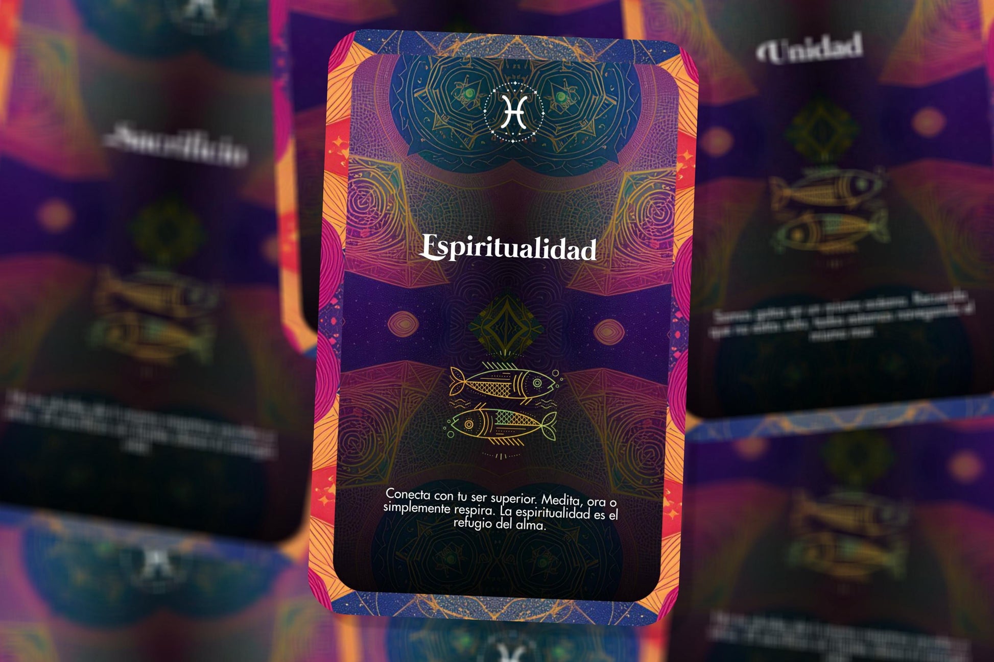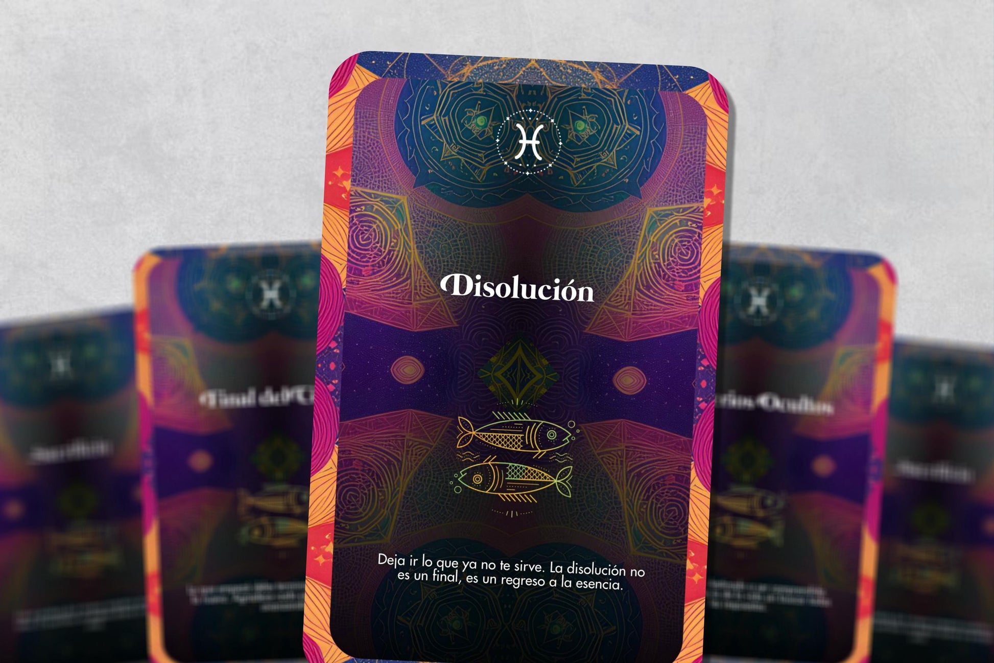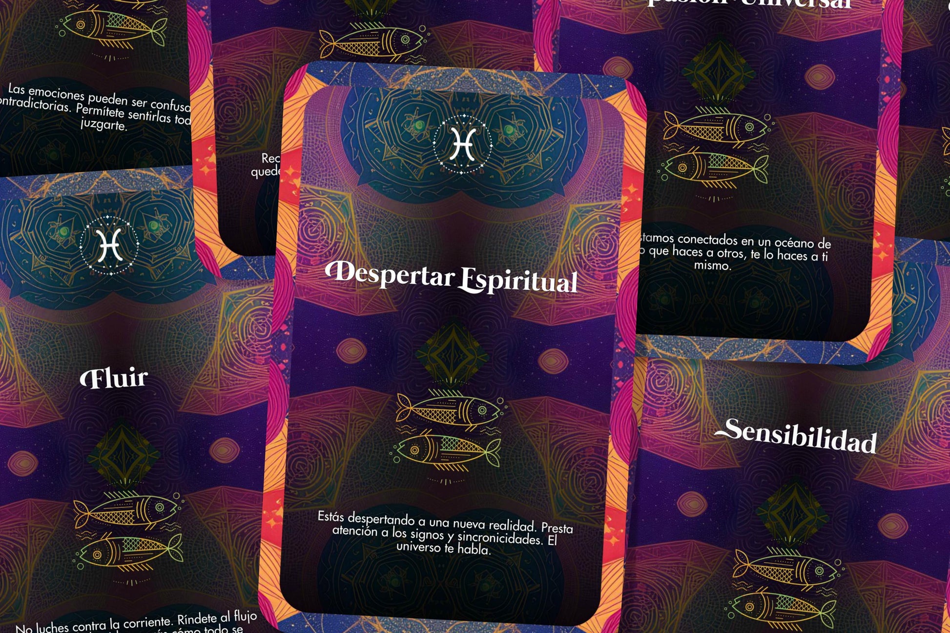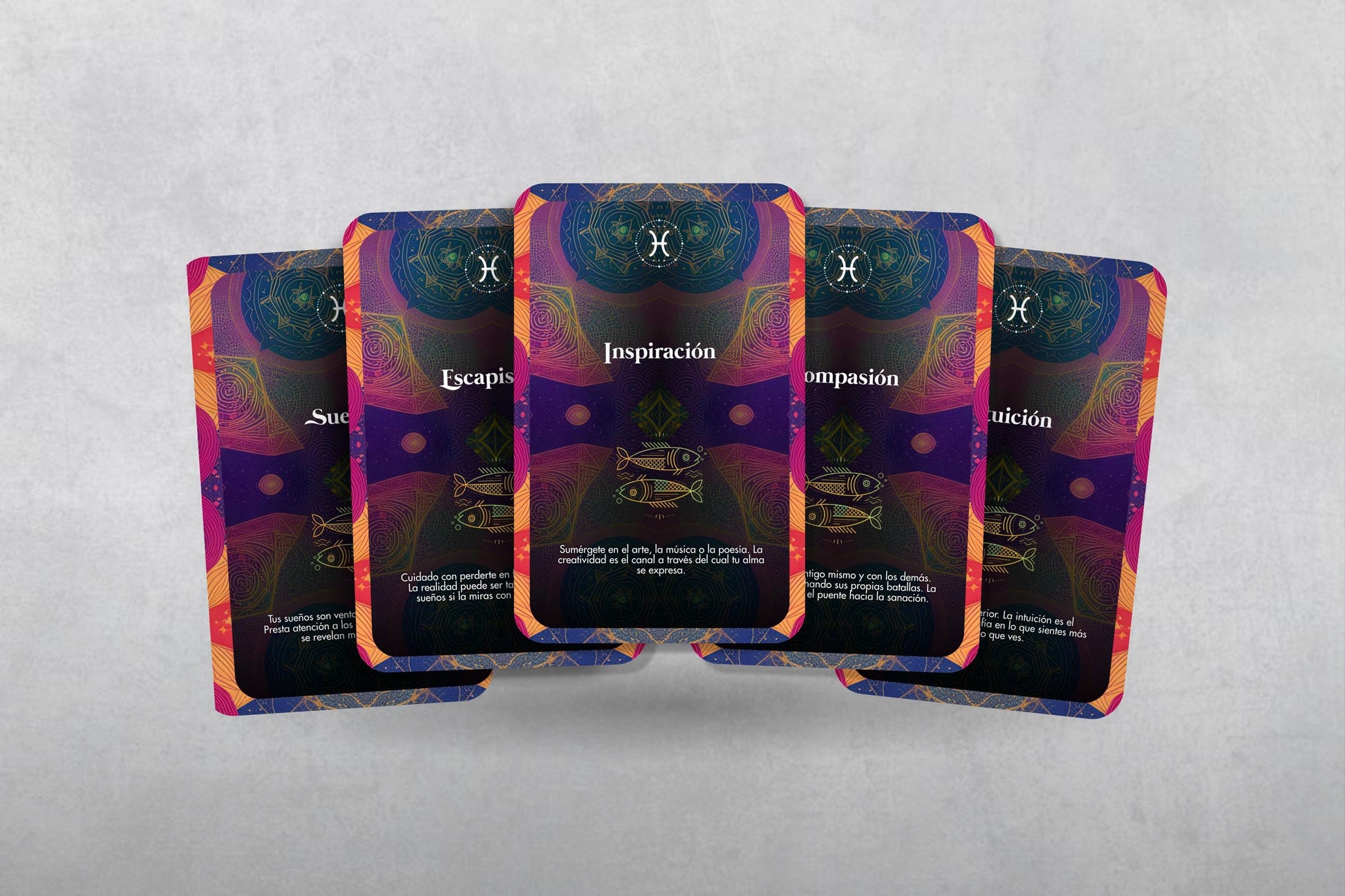 Cada carta presenta un título único y un mensaje personal que refleja los rasgos y fortalezas de Piscis, como la empatía, la creatividad y la espiritualidad.