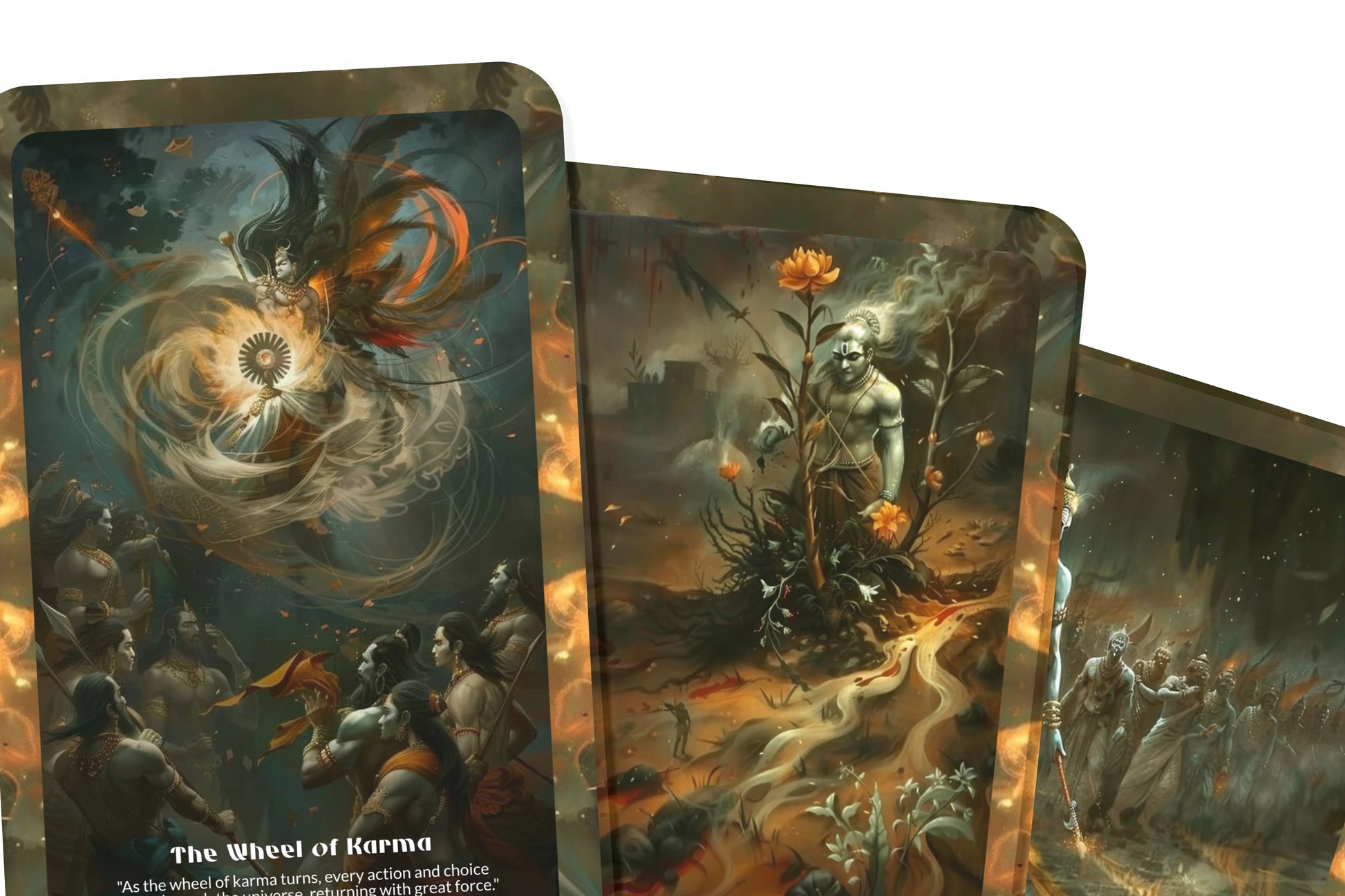 The Phoenix of Kurukshetra Oracle draws upon the epic narrative of the Mahabharata, particularly the concept of rebirth and transformation after devastation. This oracle channels the energy of the phoenix, symbolizing resurrection and renewal, guiding seekers through personal crises and helping them rise from the ashes of past challenges into a renewed sense of purpose and strength. Kurukshetra is the sacred battlefield where the Mahabharata war took place, and it is a place of profound transformation. The Phoenix of Kurukshetra Oracle encourages individuals to view challenges as opportunities for rebirth, urging them to find strength, wisdom, and clarity after suffering. It reminds seekers that, like the phoenix, they too can rise from their struggles to manifest a renewed vision for their lives.