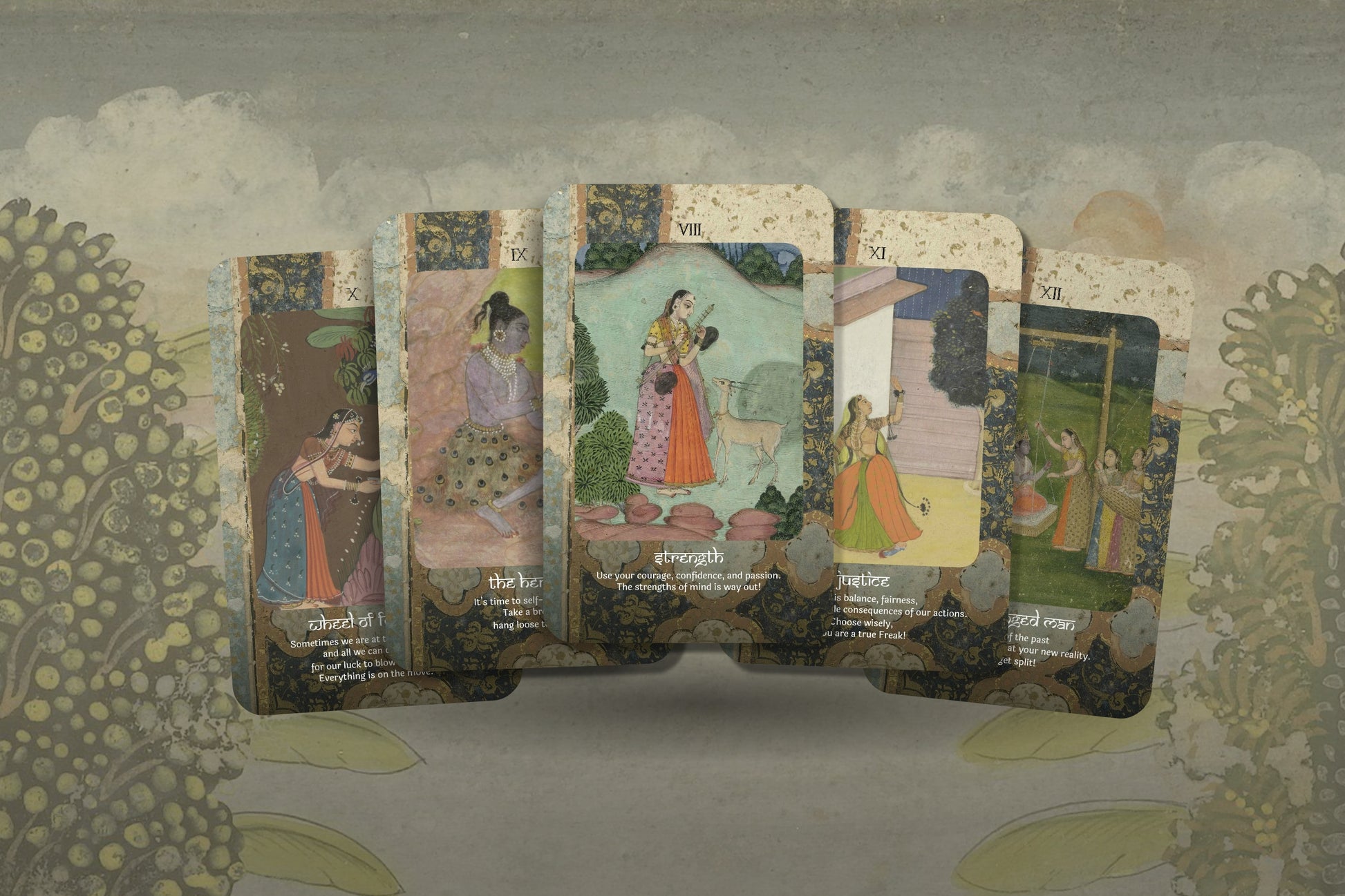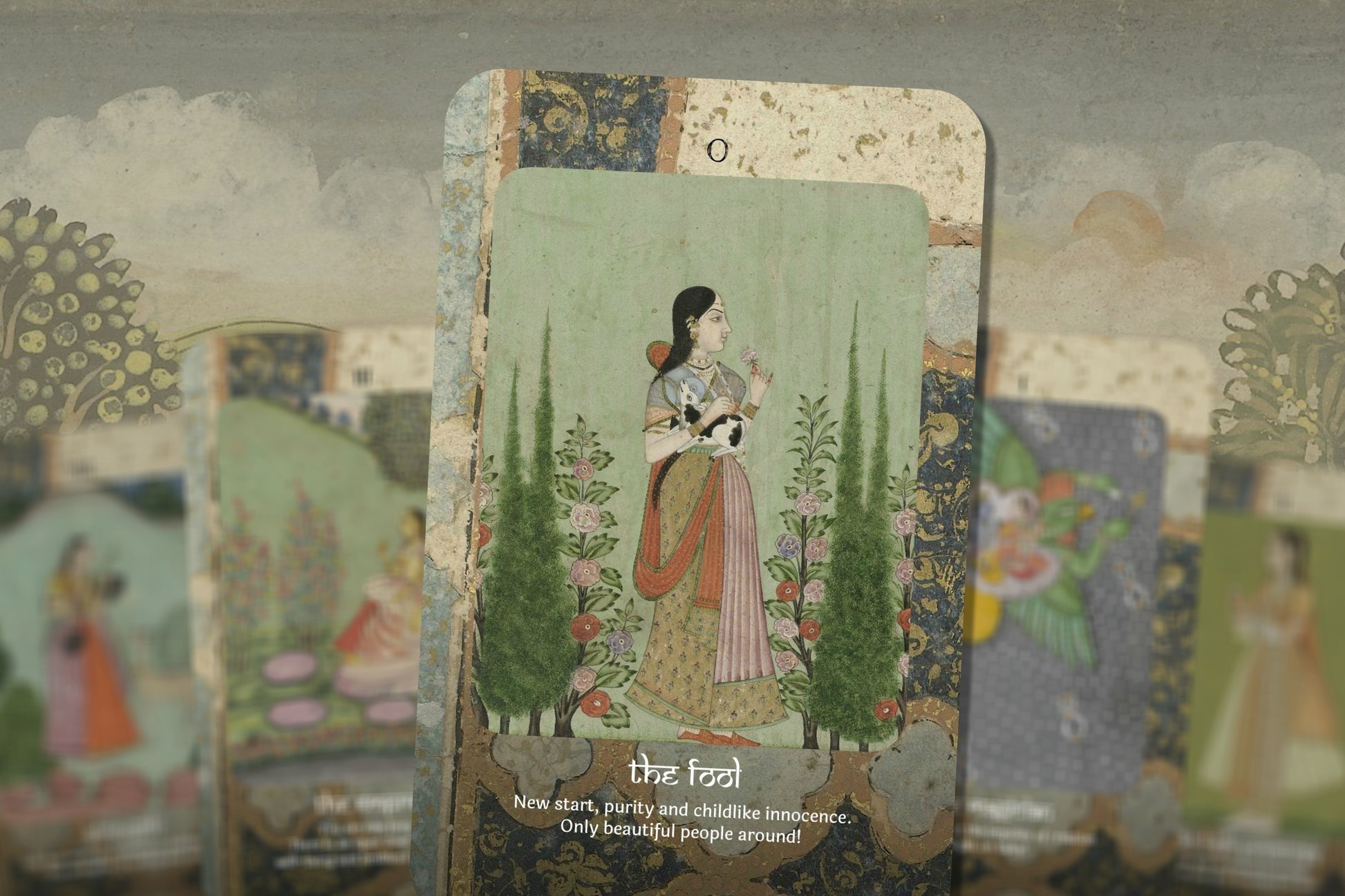 The 22 major arcana cards in this distinctive deck celebrate the works of 22 amazing anonymous Indian artists who flourished from the 17th to the mid-18th century. Each card is a tribute to the rich artistic heritage of India during this period, bringing to life the vibrant and intricate styles that graced the subcontinent.