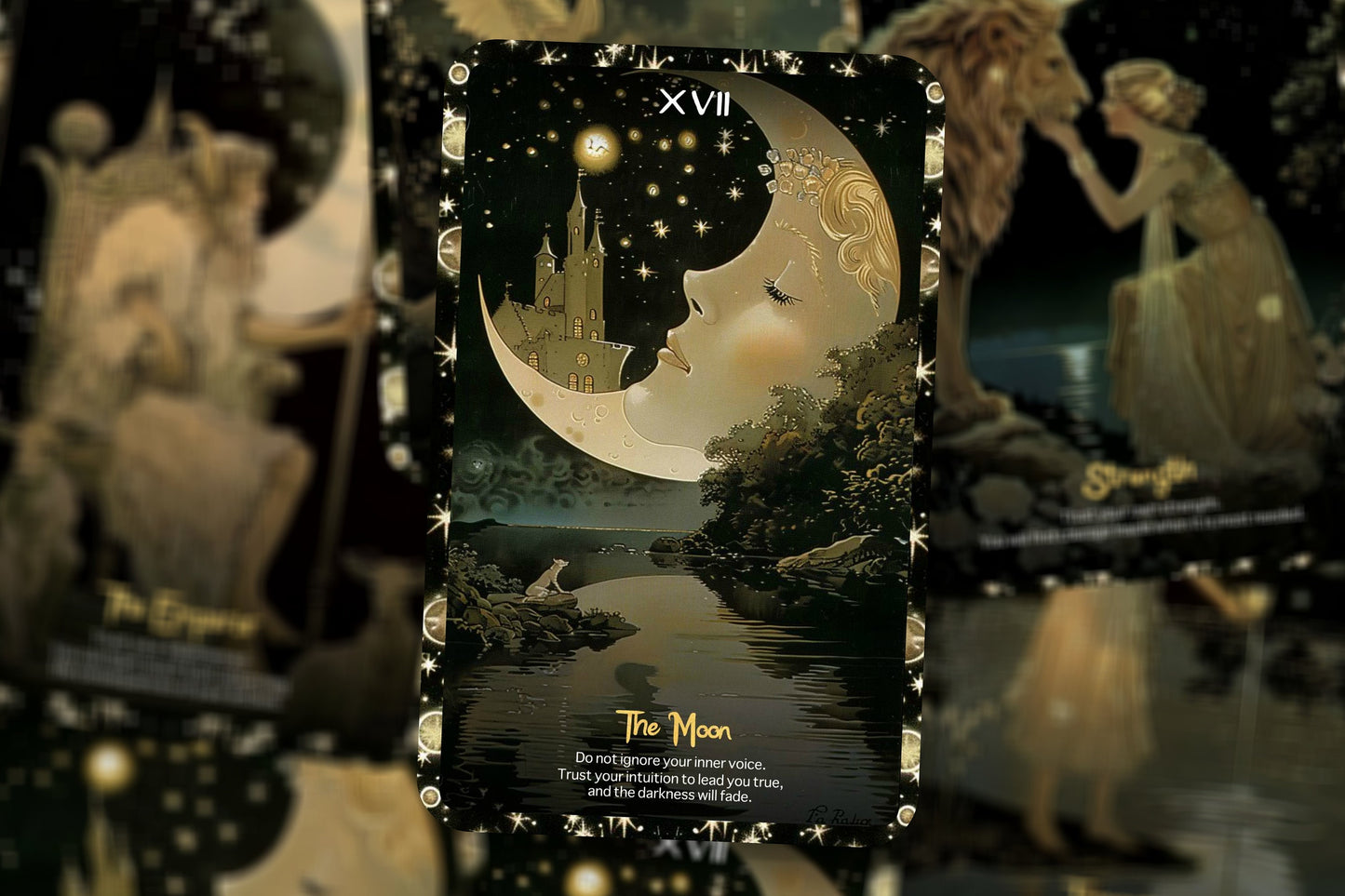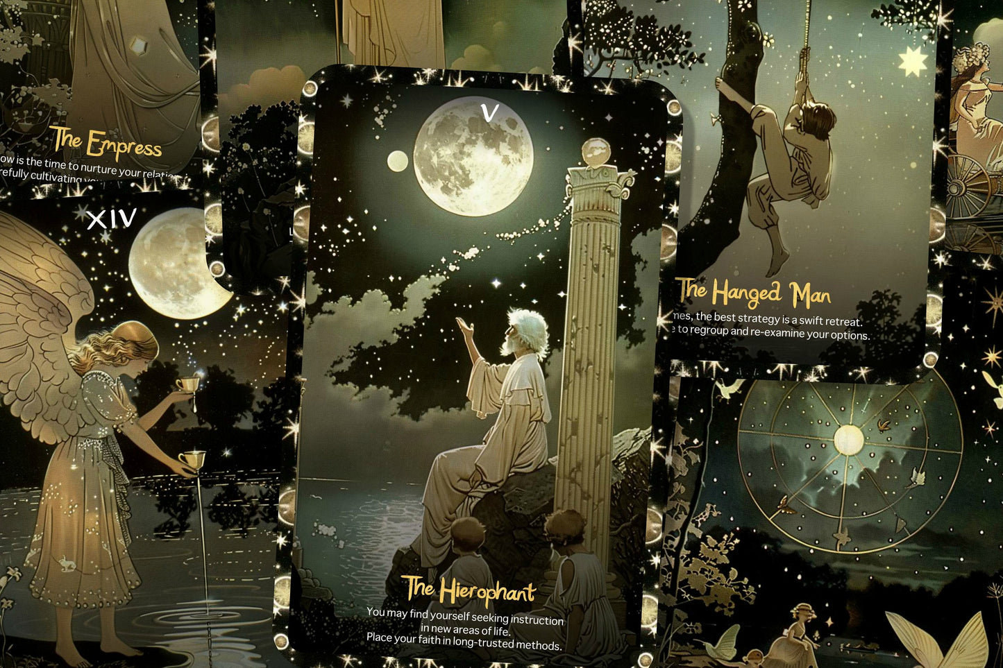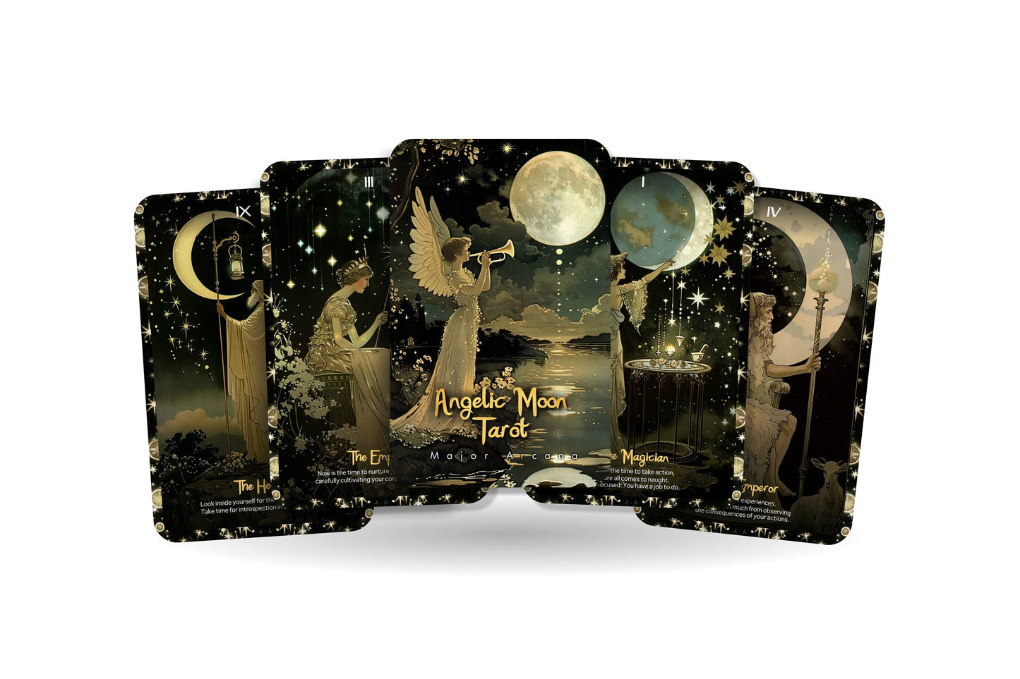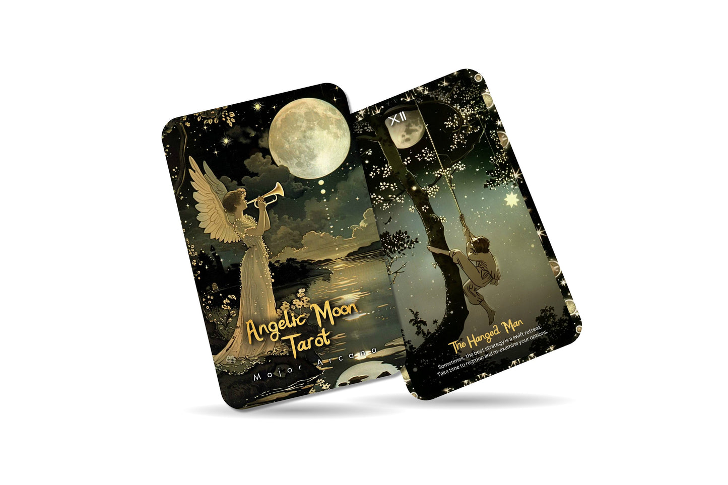 Each card is a work of art, featuring ethereal angels under the serene glow of a full moon. The imagery blends timeless elegance with a touch of the supernatural, capturing the essence of angelic guidance and lunar magic.