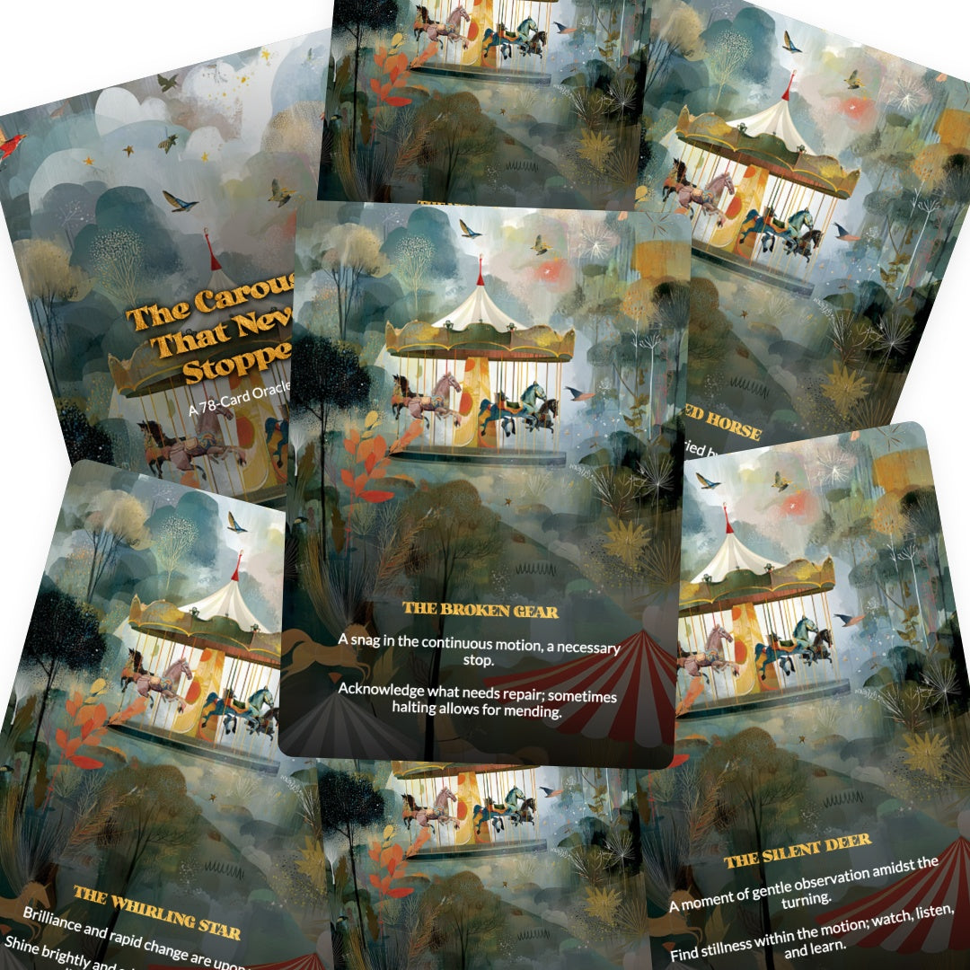 Hop on and take a joyful ride with the Eternal Carousel Oracle Deck, a lively 78-card set inspired by the enchanting tale of 'The Carousel That Never Stopped.' Each card spins a story filled with whimsy and wisdom, capturing life’s beautiful cycles and the endless dance of change. This deck invites you to embrace the ups and downs with a playful heart, offering timeless guidance and fresh insights every time you draw. Whether you seek answers, inspiration, or a dash of magic, let this carousel whirl you through the twists and turns of your journey with bright, joyful energy.