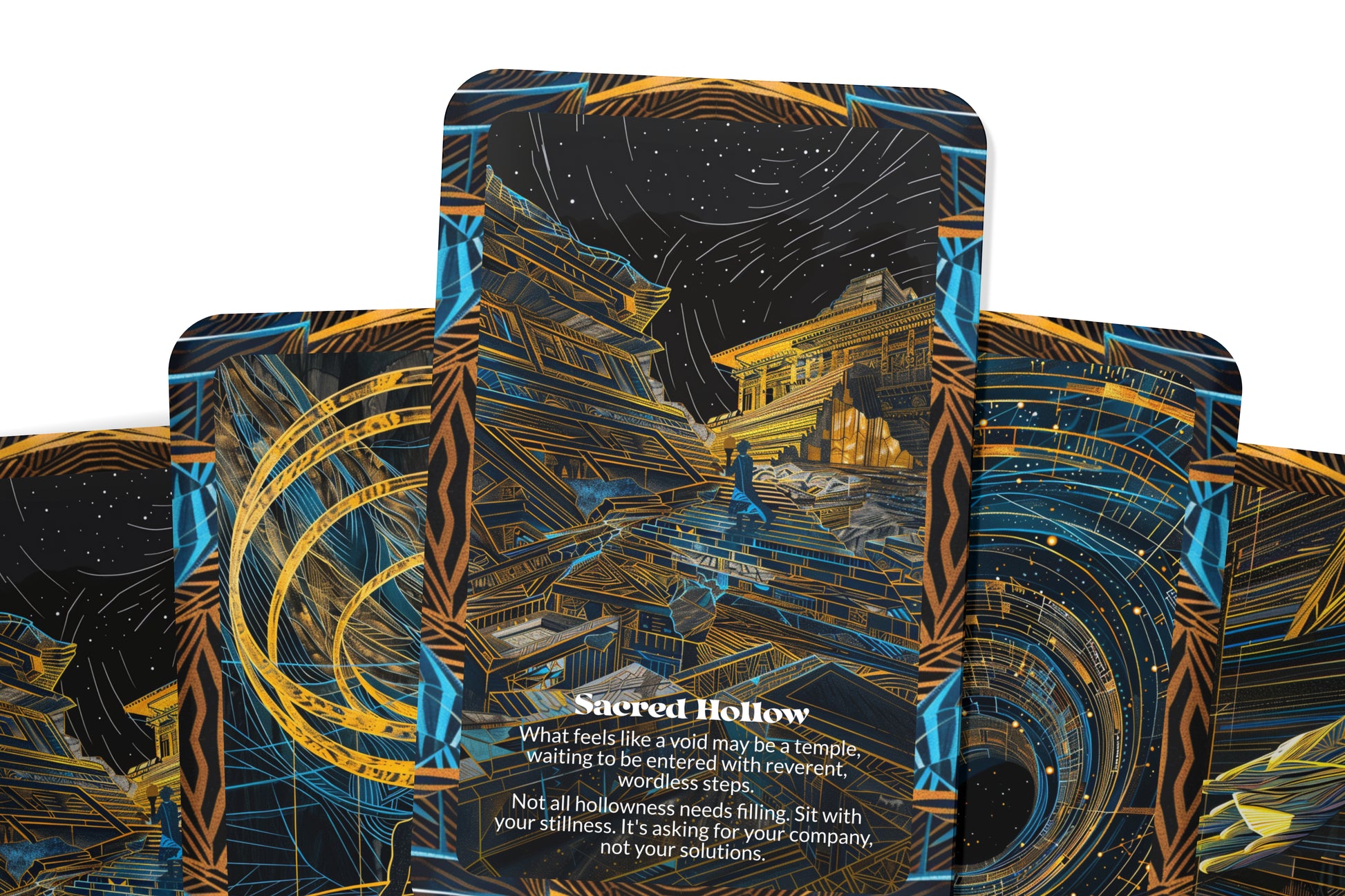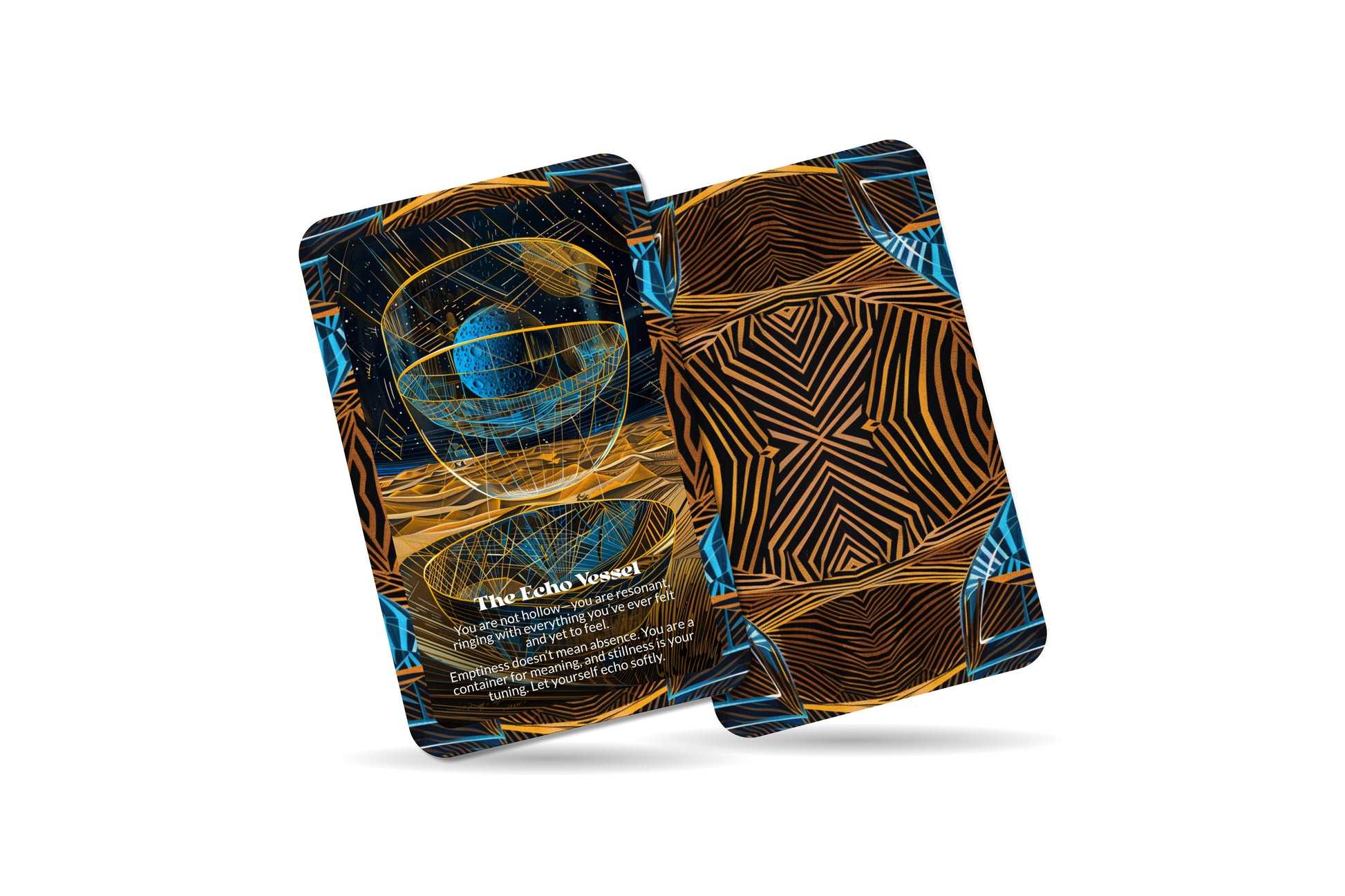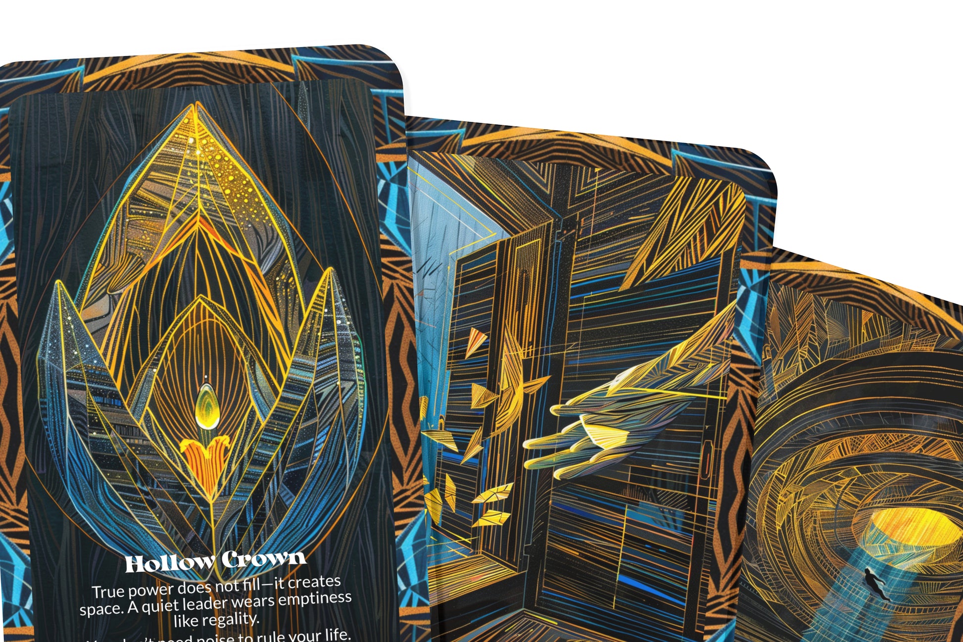 “Hollow Golden – Spiritual Emptiness & Beauty” - Hollow Golden invites you to explore the beauty of spiritual emptiness, where there is nothing left to grasp or hold onto. This card speaks to the space between your desires, your attachments, and your sense of self—where all is open and full of possibility. It’s in this emptiness that true spiritual beauty resides, free from the weight of expectations or material concerns. This card encourages you to embrace the power of spaciousness in your spiritual journey. Hollow Golden reminds you that emptiness is not a void, but a fertile ground for new experiences, clarity, and insight. In the absence of clutter, you can hear the quiet whispers of your soul and the universe. Let go of the need to fill every space, and find peace in the sacred emptiness.