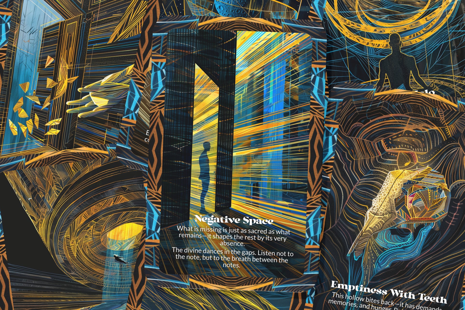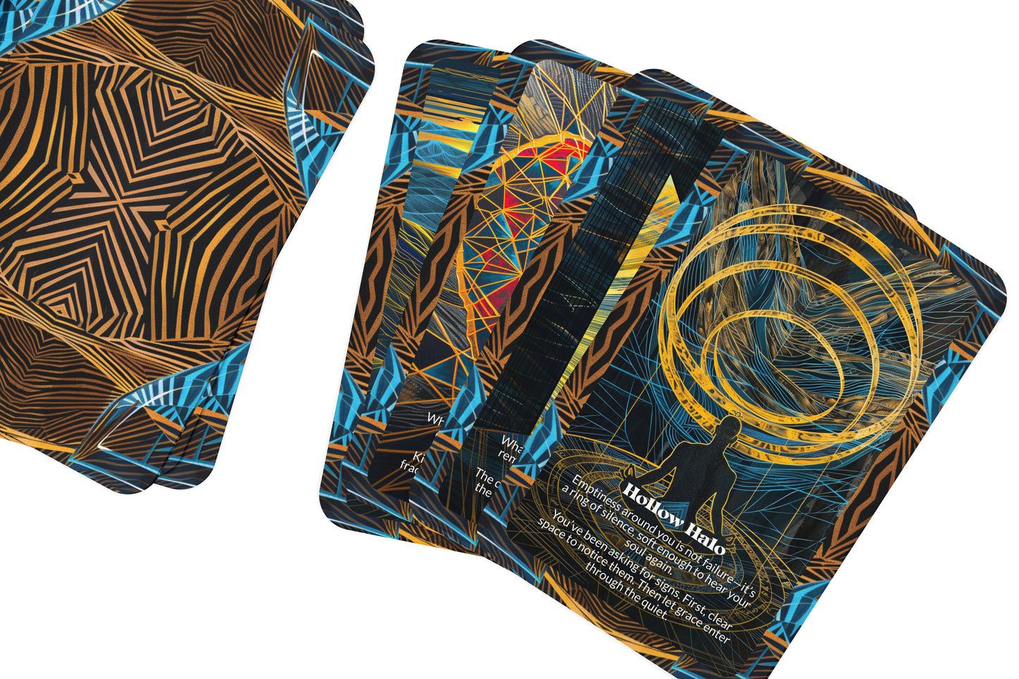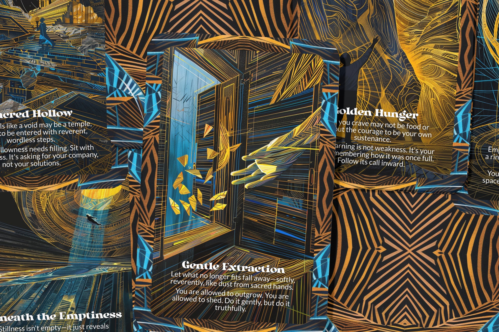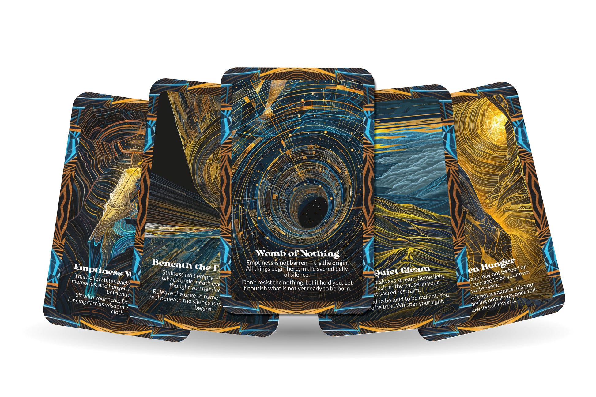 “Hollow Golden – Spiritual Emptiness & Beauty” - Hollow Golden invites you to explore the beauty of spiritual emptiness, where there is nothing left to grasp or hold onto. This card speaks to the space between your desires, your attachments, and your sense of self—where all is open and full of possibility. It’s in this emptiness that true spiritual beauty resides, free from the weight of expectations or material concerns. This card encourages you to embrace the power of spaciousness in your spiritual journey. Hollow Golden reminds you that emptiness is not a void, but a fertile ground for new experiences, clarity, and insight. In the absence of clutter, you can hear the quiet whispers of your soul and the universe. Let go of the need to fill every space, and find peace in the sacred emptiness.
