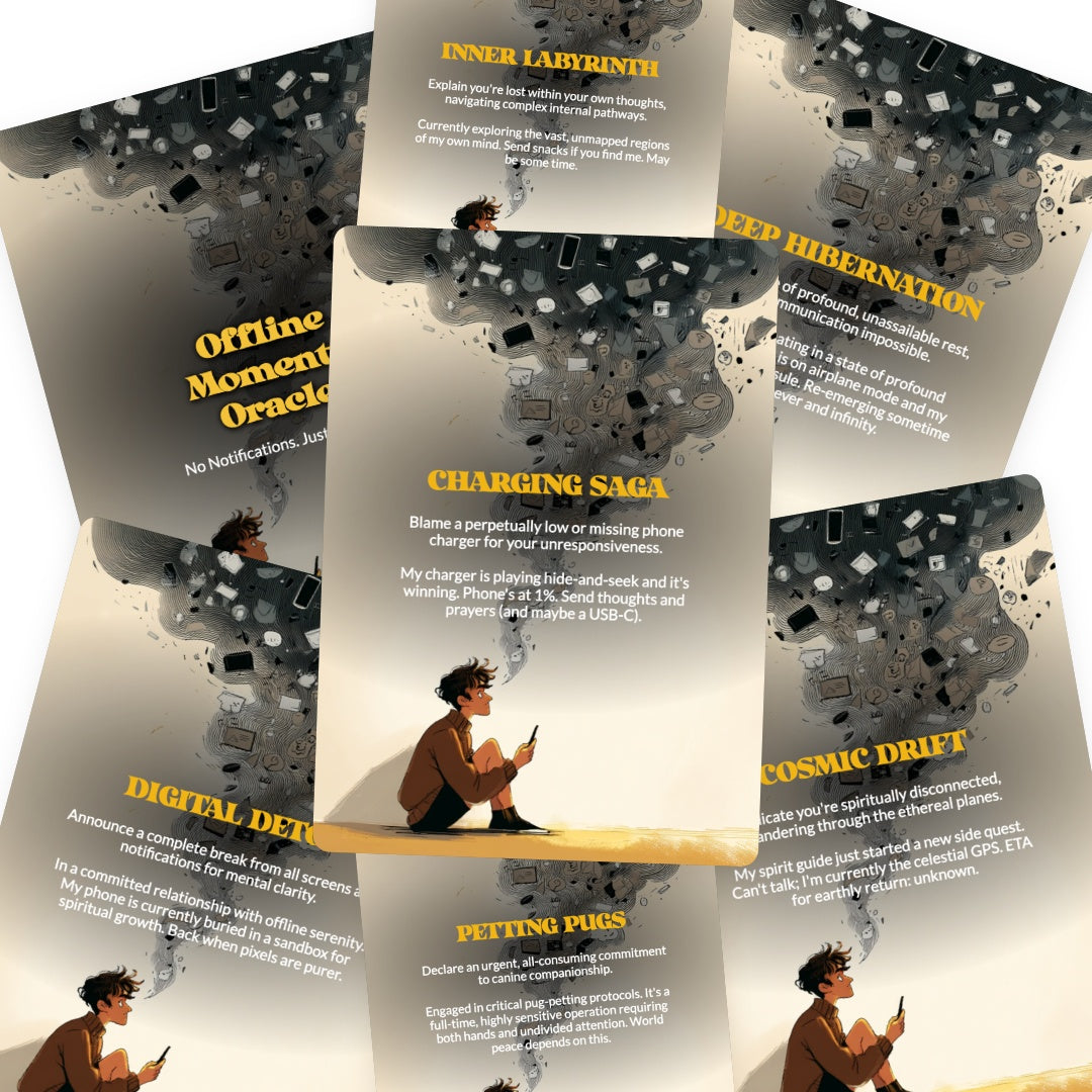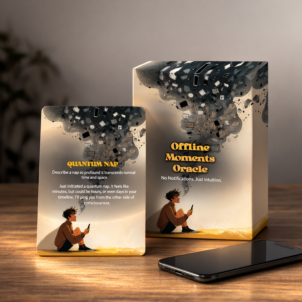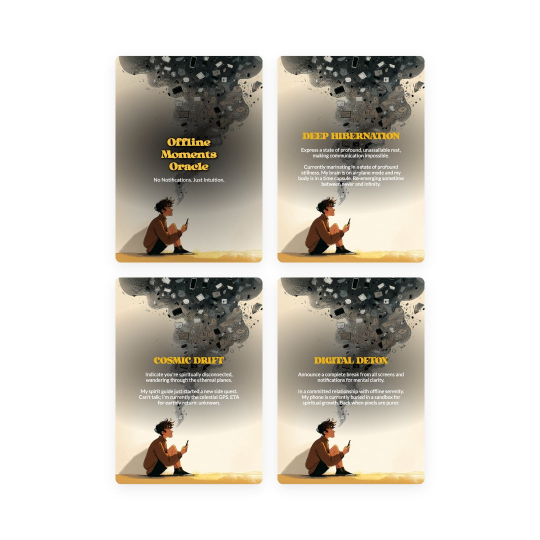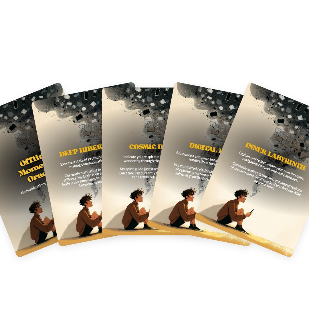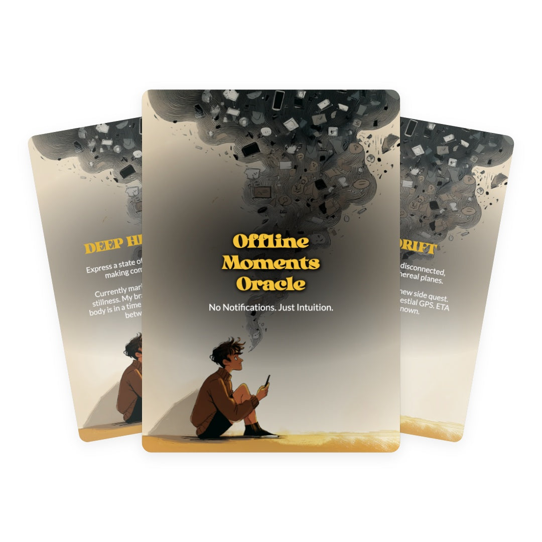 Tired of your phone knowing you better than you know yourself? This 78-card oracle deck is your permission slip to ghost the internet—guilt-free. Each card whispers ancient wisdom about silence, solitude, and the radical act of being unreachable. Perfect for spiritual seekers, burnt-out scrollers, and anyone who's ever fantasized about throwing their device into the sea. Discover what your soul has been trying to tell you when nobody's watching.