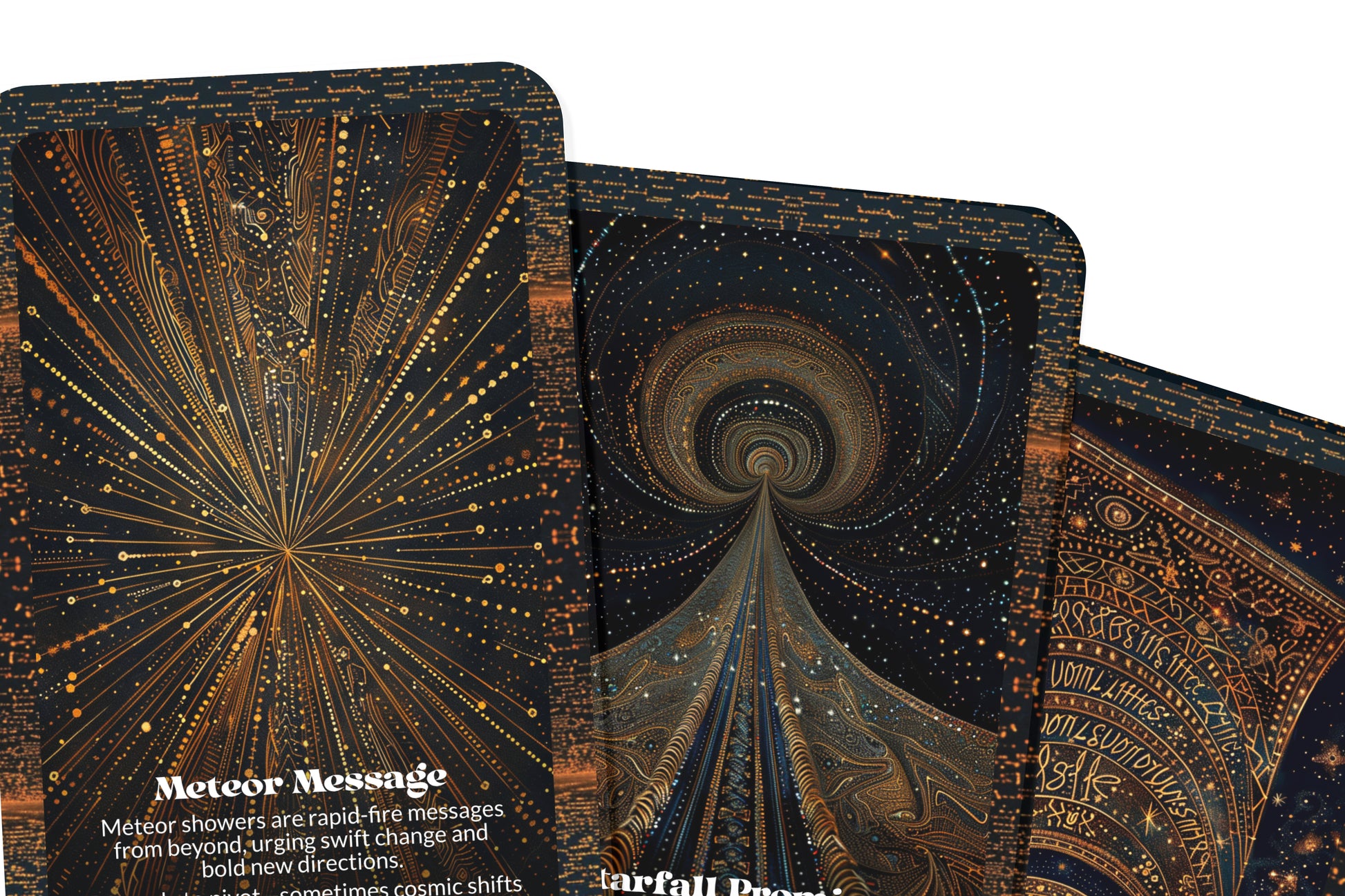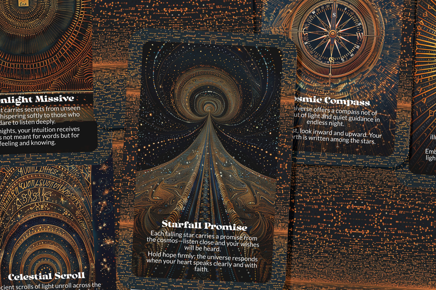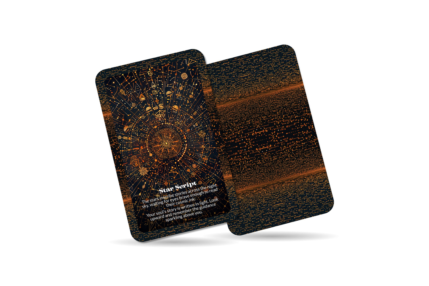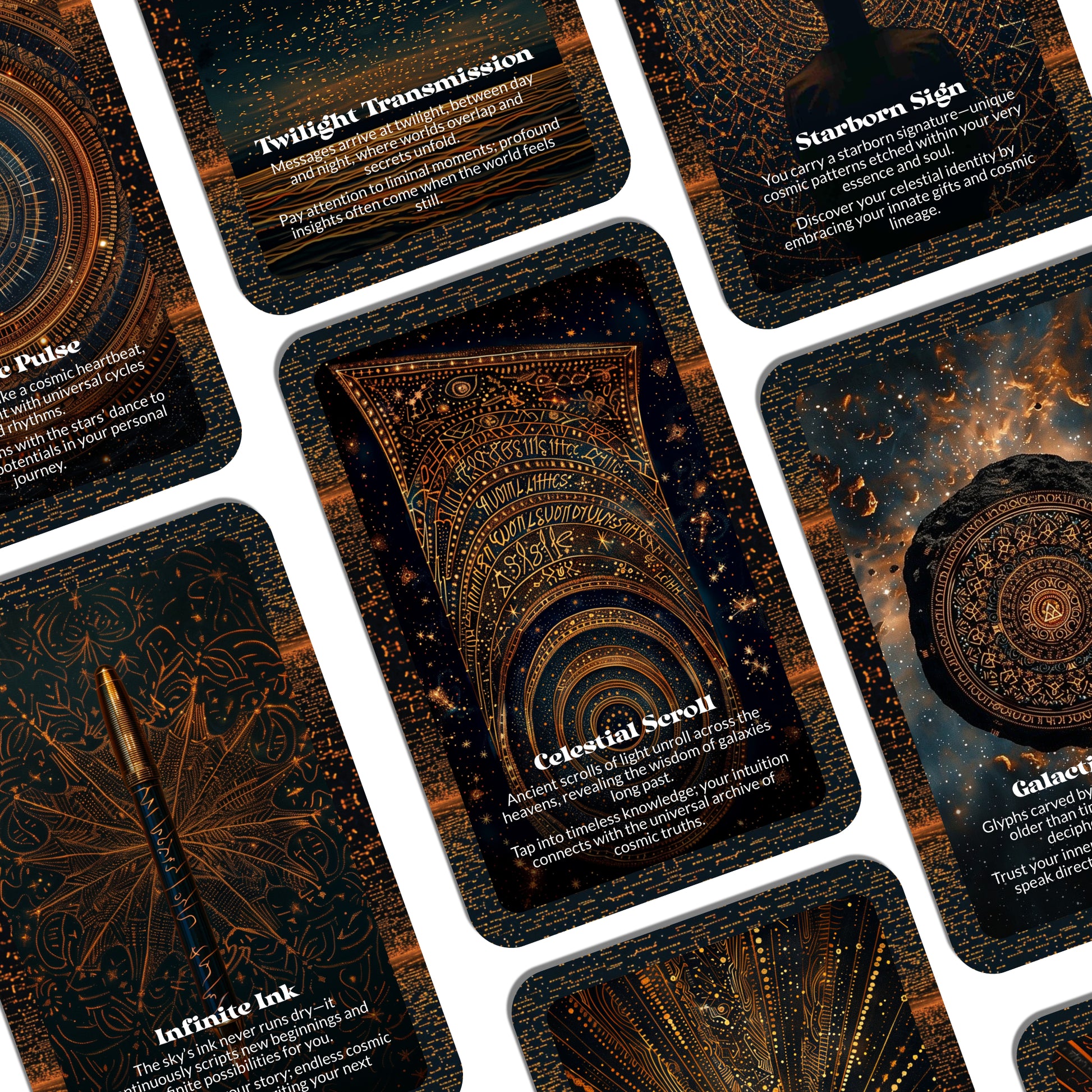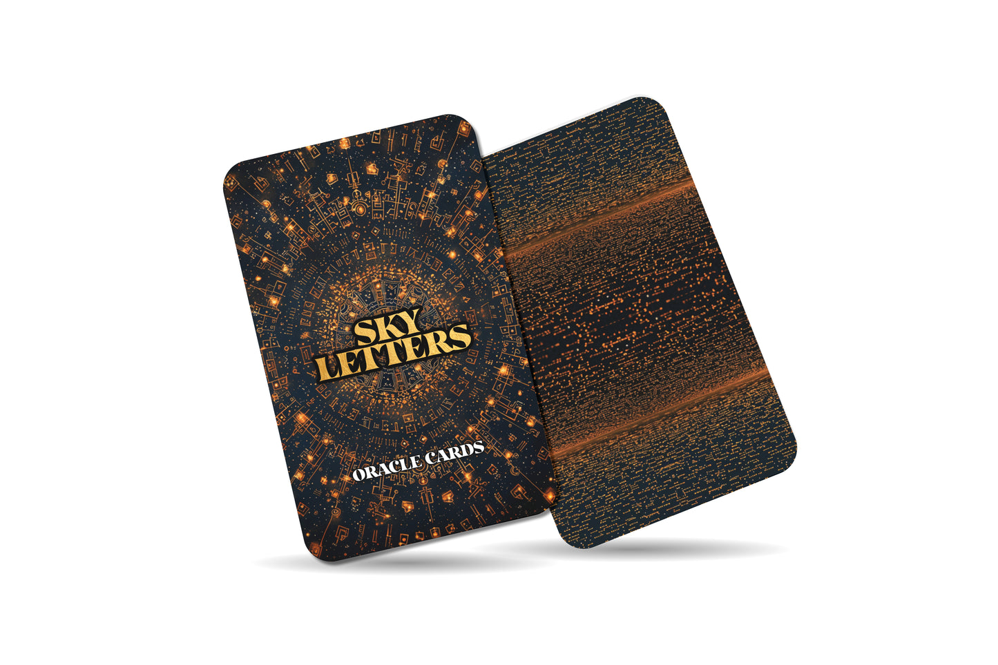 “Sky Letters – Cosmic Messaging” - Sky Letters speaks to the subtle messages that come from the cosmos, inviting you to pay attention to the signs and symbols that surround you. The sky above, filled with stars and constellations, serves as a vast cosmic letter, offering guidance from the universe. This card suggests that you are being communicated with through dreams, synchronicities, or unexpected moments of insight. The messages may be cryptic or come in unexpected forms, but they hold the answers you seek. By becoming more attuned to the cosmic language of the universe, you open yourself to a deeper level of guidance and understanding. Trust the messages that come through, knowing they are aligned with your highest good.