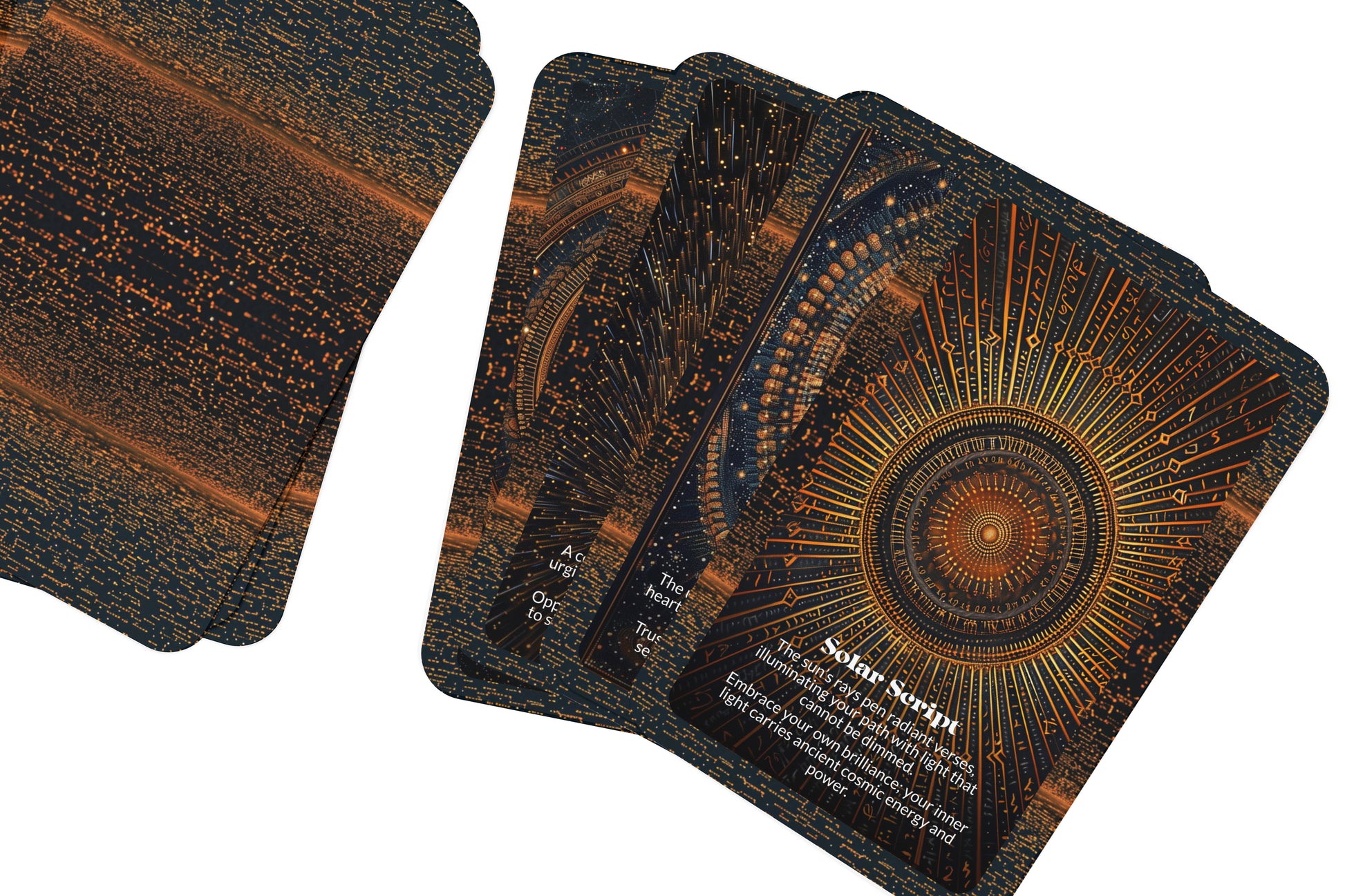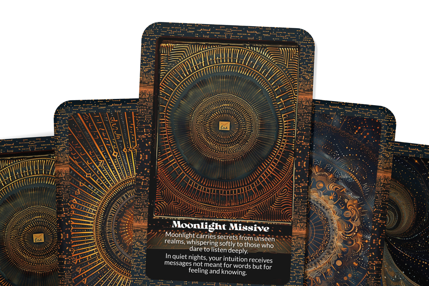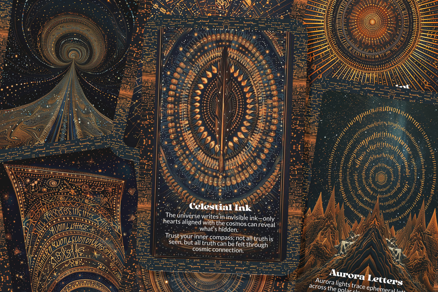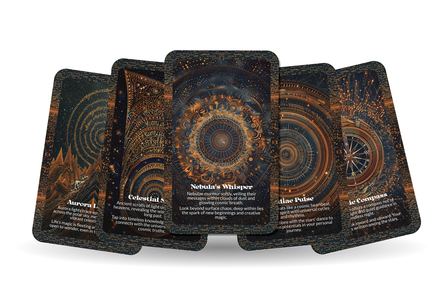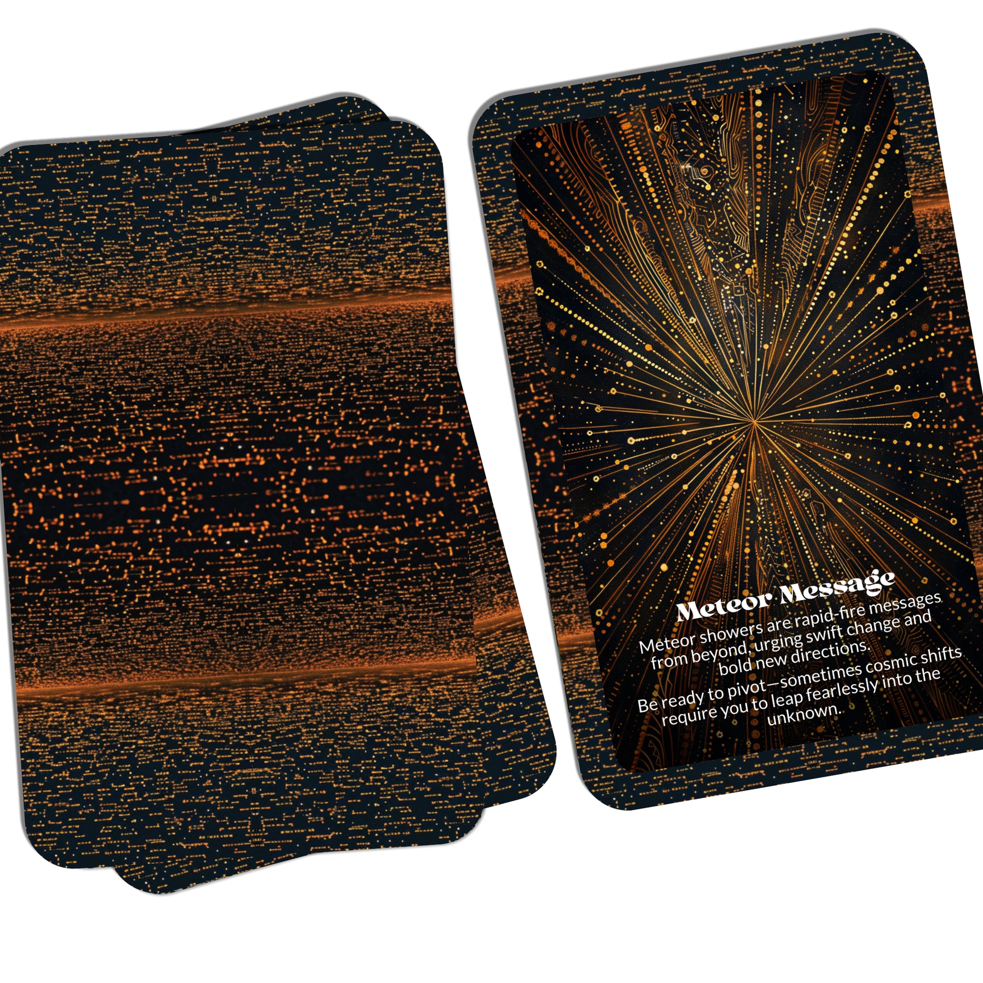 “Sky Letters – Cosmic Messaging” - Sky Letters speaks to the subtle messages that come from the cosmos, inviting you to pay attention to the signs and symbols that surround you. The sky above, filled with stars and constellations, serves as a vast cosmic letter, offering guidance from the universe. This card suggests that you are being communicated with through dreams, synchronicities, or unexpected moments of insight. The messages may be cryptic or come in unexpected forms, but they hold the answers you seek. By becoming more attuned to the cosmic language of the universe, you open yourself to a deeper level of guidance and understanding. Trust the messages that come through, knowing they are aligned with your highest good.