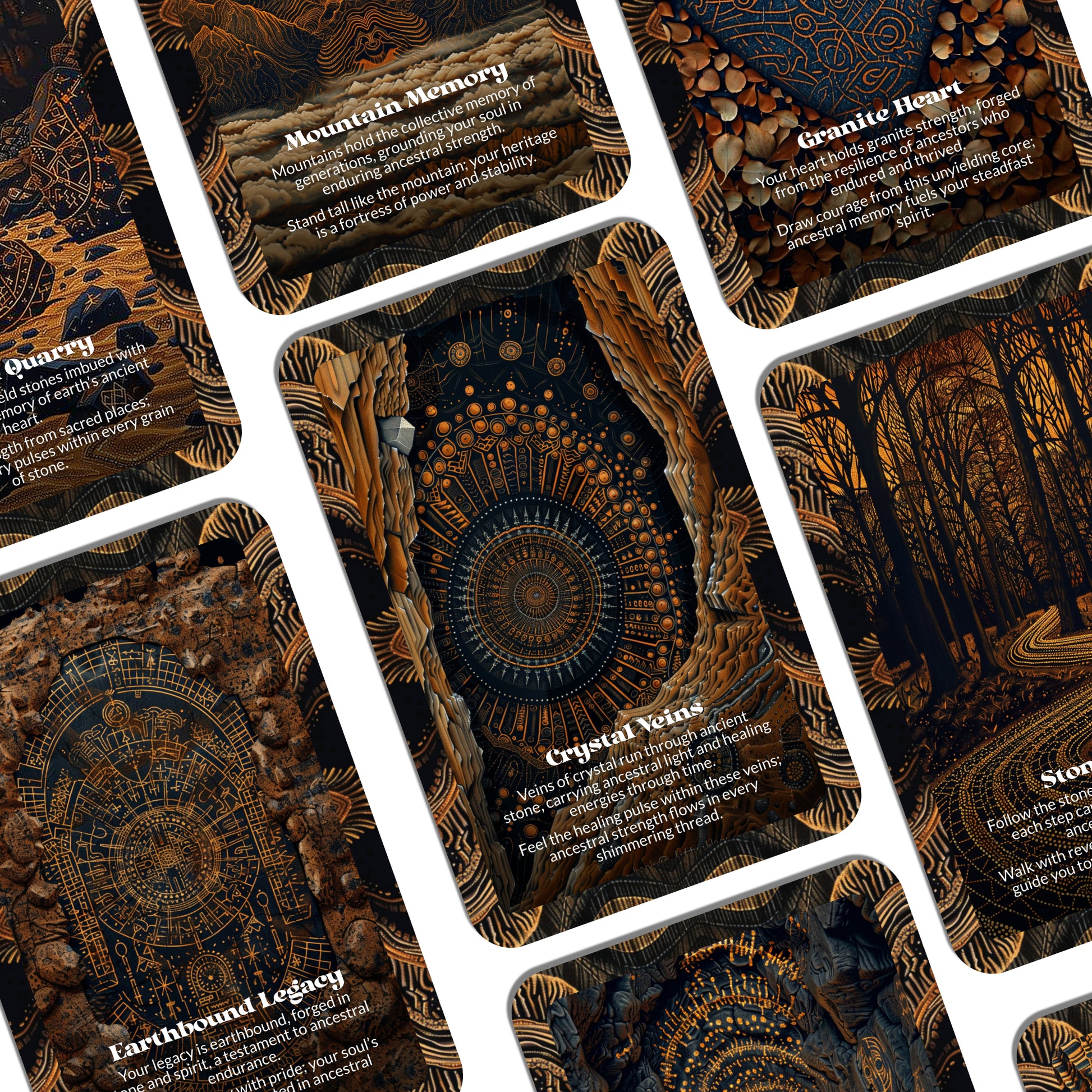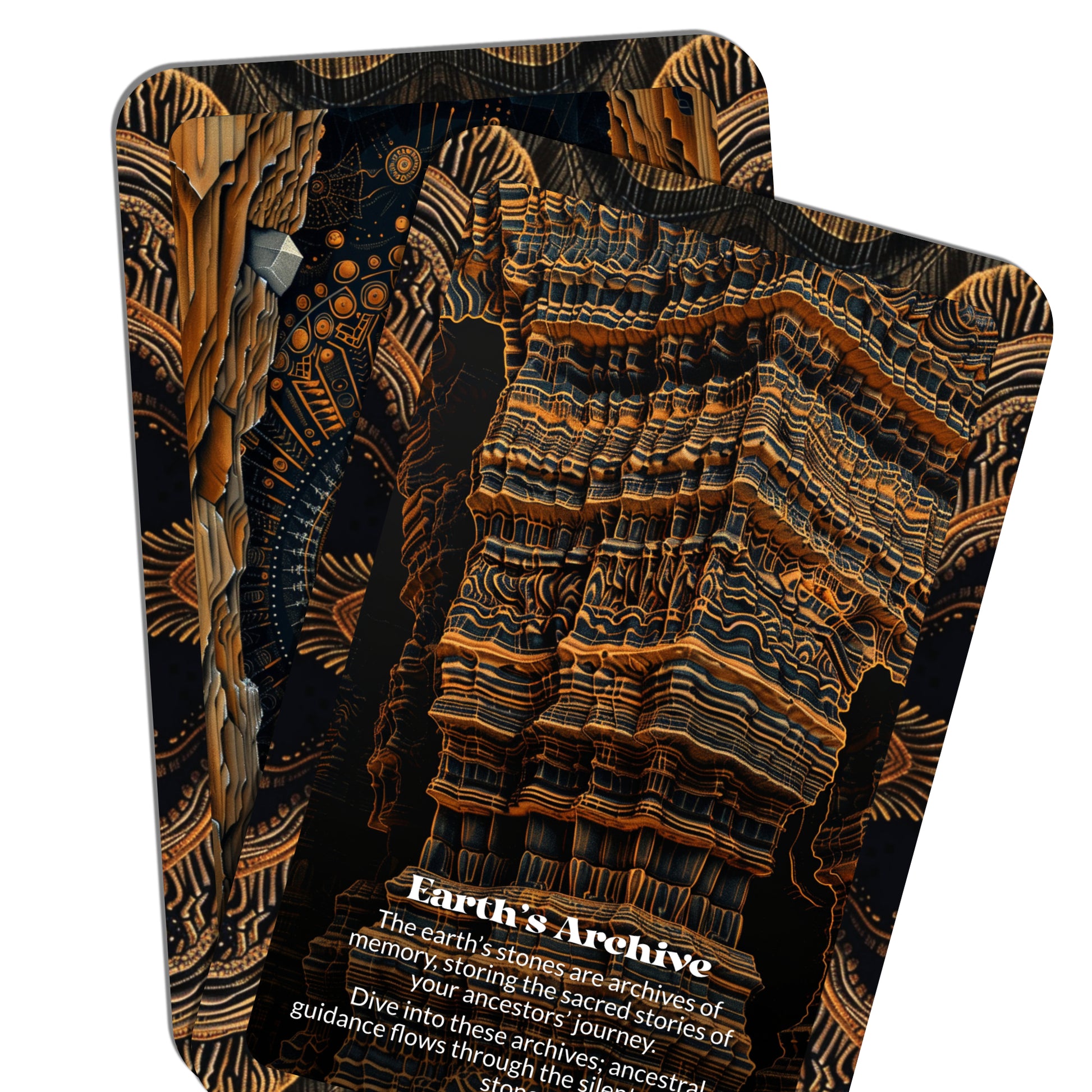 “Stone Memory – Ancestral Earth Connection” - Stone Memory speaks to the deep, ancestral connection held within the earth. The card invites you to explore the wisdom passed down through generations, often embedded in the stones, mountains, and landscapes of the earth. These ancient memories are waiting to be uncovered, offering guidance from your ancestors and the earth itself. By attuning to the energy of the land, you can reconnect with your roots and discover insights that have been stored within the earth for centuries. Stone Memory encourages you to honour the wisdom of your lineage and the earth’s powerful, grounding presence. This card is a reminder that you are never alone; you are supported by the vast network of wisdom that stretches back through time.