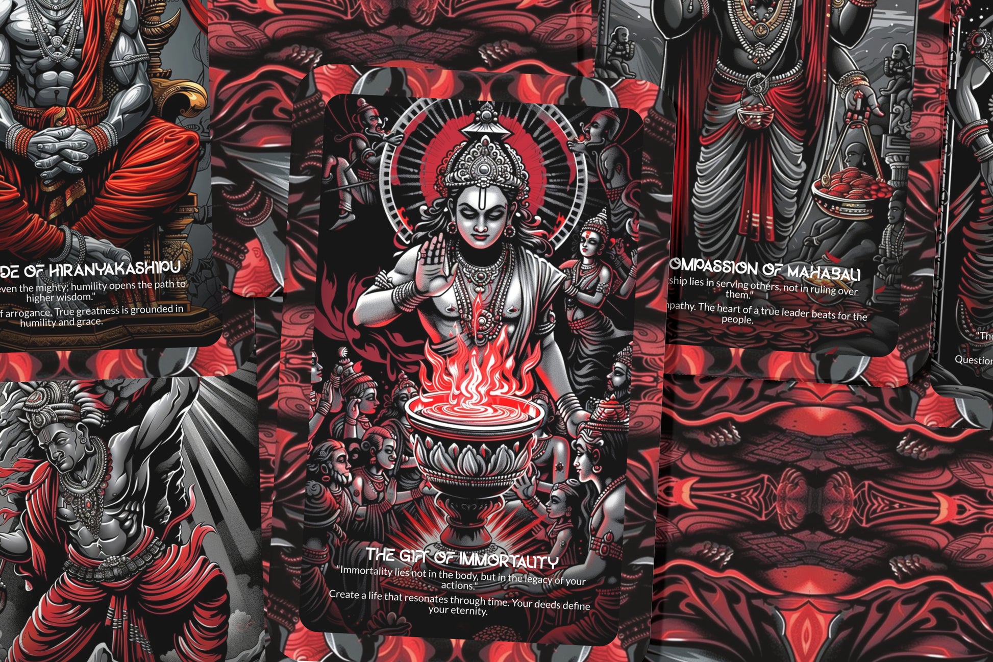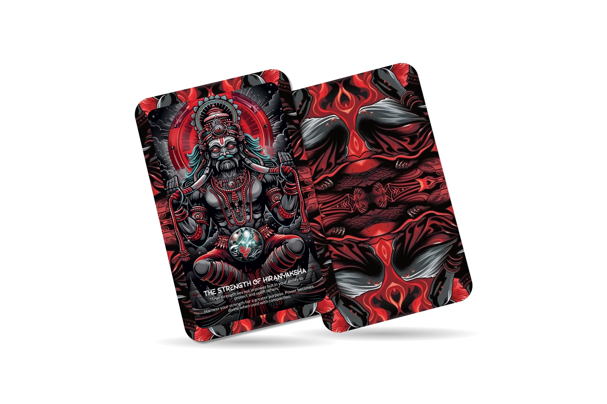 The Daitya Chronicles Oracle taps into the ancient stories of the Daityas, the demon-like beings from Indian mythology. These beings, often misunderstood, embody the forces of chaos, transformation, and the shadows within the self. This oracle invites seekers to embrace their inner darkness, offering guidance on how to navigate personal challenges and bring balance between light and shadow. In Hindu mythology, the Daityas are often portrayed as antagonists to the gods, but they also hold vital lessons about transformation and power. The Daitya Chronicles Oracle challenges individuals to embrace their inner complexities and face the darker aspects of their psyche. It guides seekers through the process of integrating these forces to create harmony, recognizing that both light and shadow are necessary for spiritual growth.