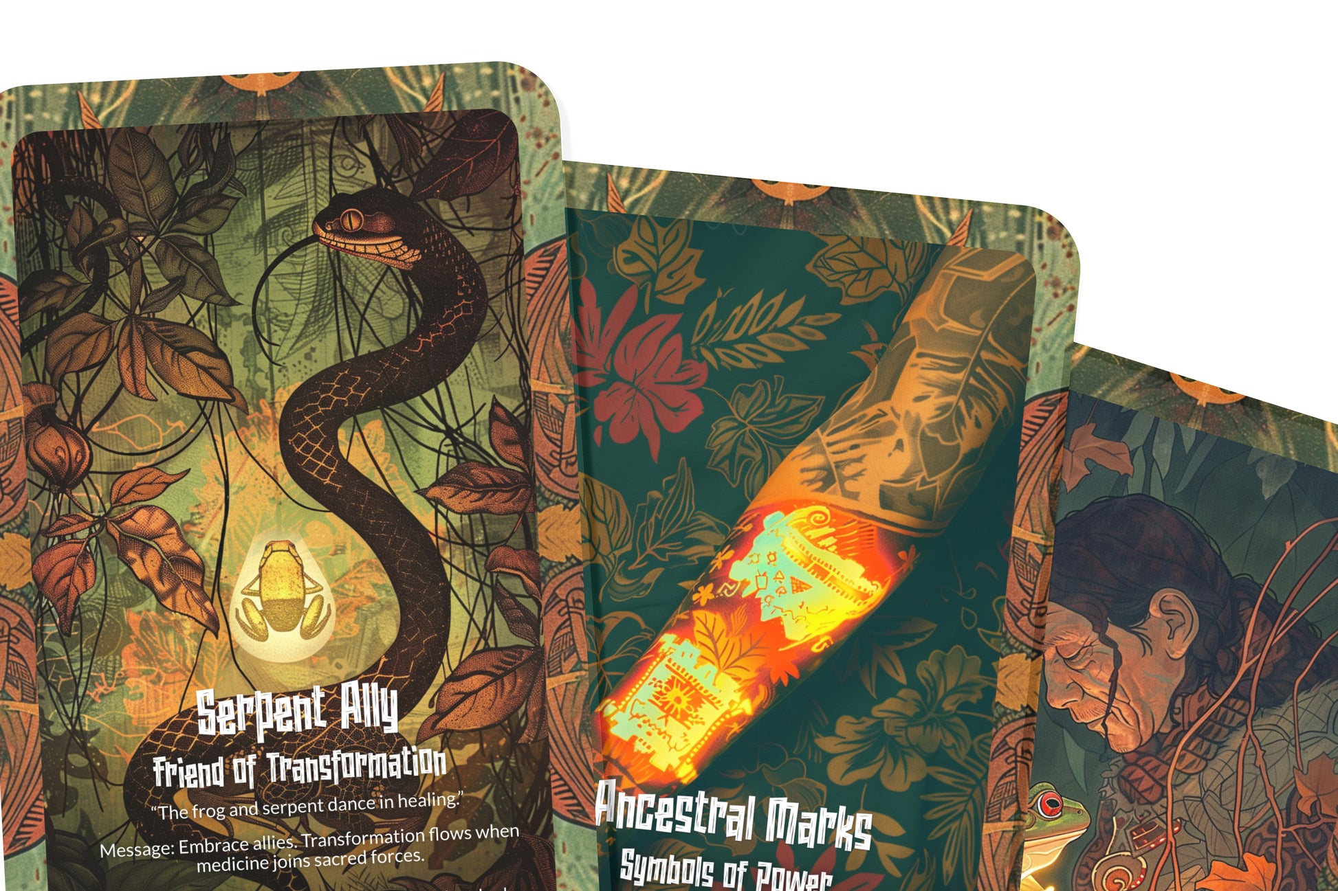 The Oracle of Kambo carries the spirit of the sacred frog, a powerful healer known for purification and resilience. It represents cleansing, protection, and the strength to release what no longer serves you. When this card appears, it calls you to shed toxins of body, mind, or spirit. The frog medicine brings clarity, renewal, and the courage to embrace transformation.Kambo reminds you that discomfort can be a doorway into healing and that release creates space for new life. This oracle teaches resilience, guiding you to rise above challenges with strength and purity. It invites you to trust the cycles of renewal, knowing every purge brings balance. The frog’s spirit assures you that cleansing is sacred, and through release, you are reborn into clarity and harmony.