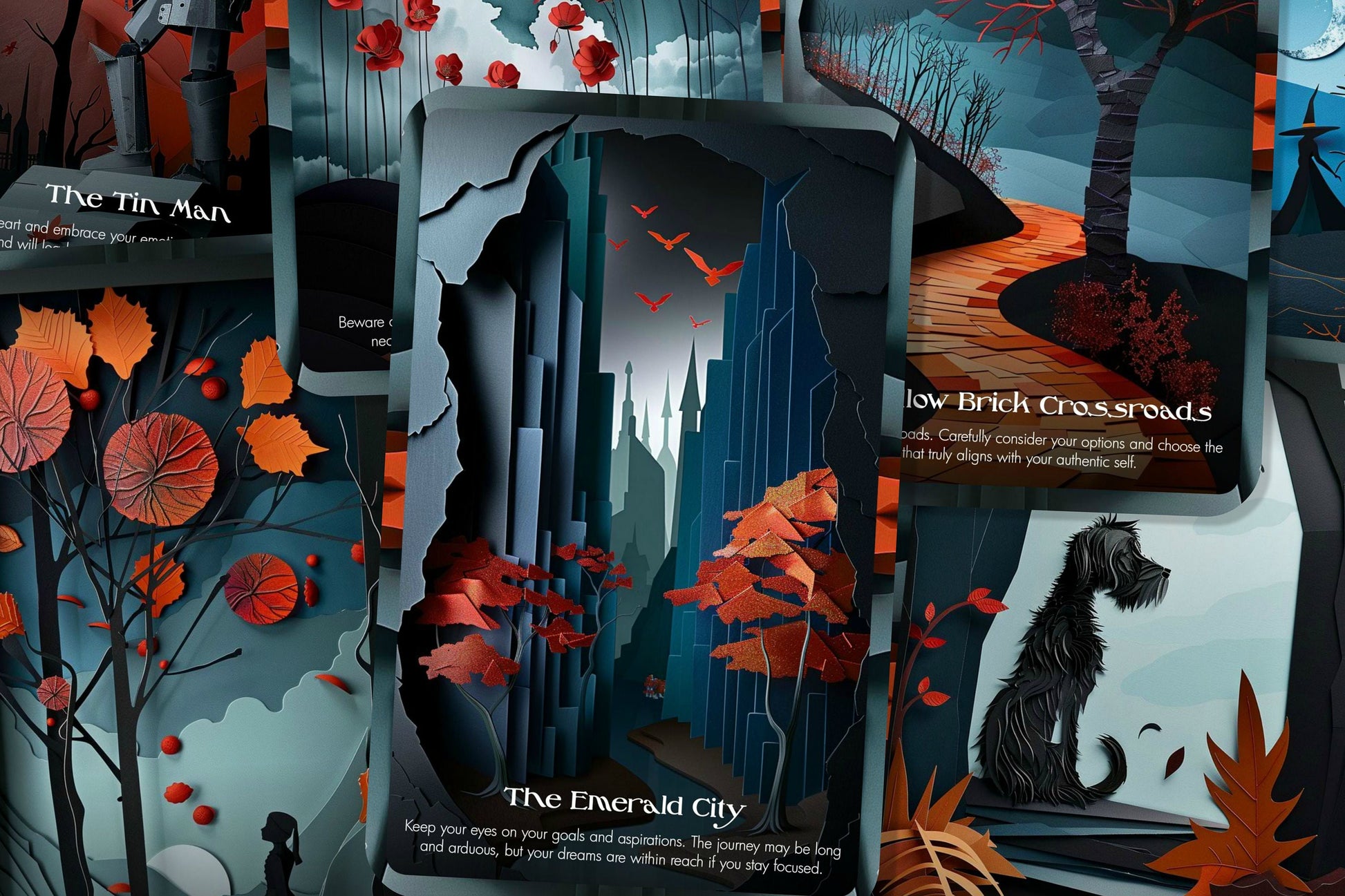 The Yellow Brick Road Oracle Deck, inspired by the timeless classic "The Wizard of Oz," is a beautifully illustrated set of 22 cards. Each card captures the essence of the beloved characters, events, and themes from the story, offering profound insights and guidance for your personal journey. From the wisdom of Glinda the Good Witch to the courage of the Cowardly Lion, and the resilience symbolized by the Yellow Brick Road itself, this deck serves as a powerful tool for introspection and self-discovery.