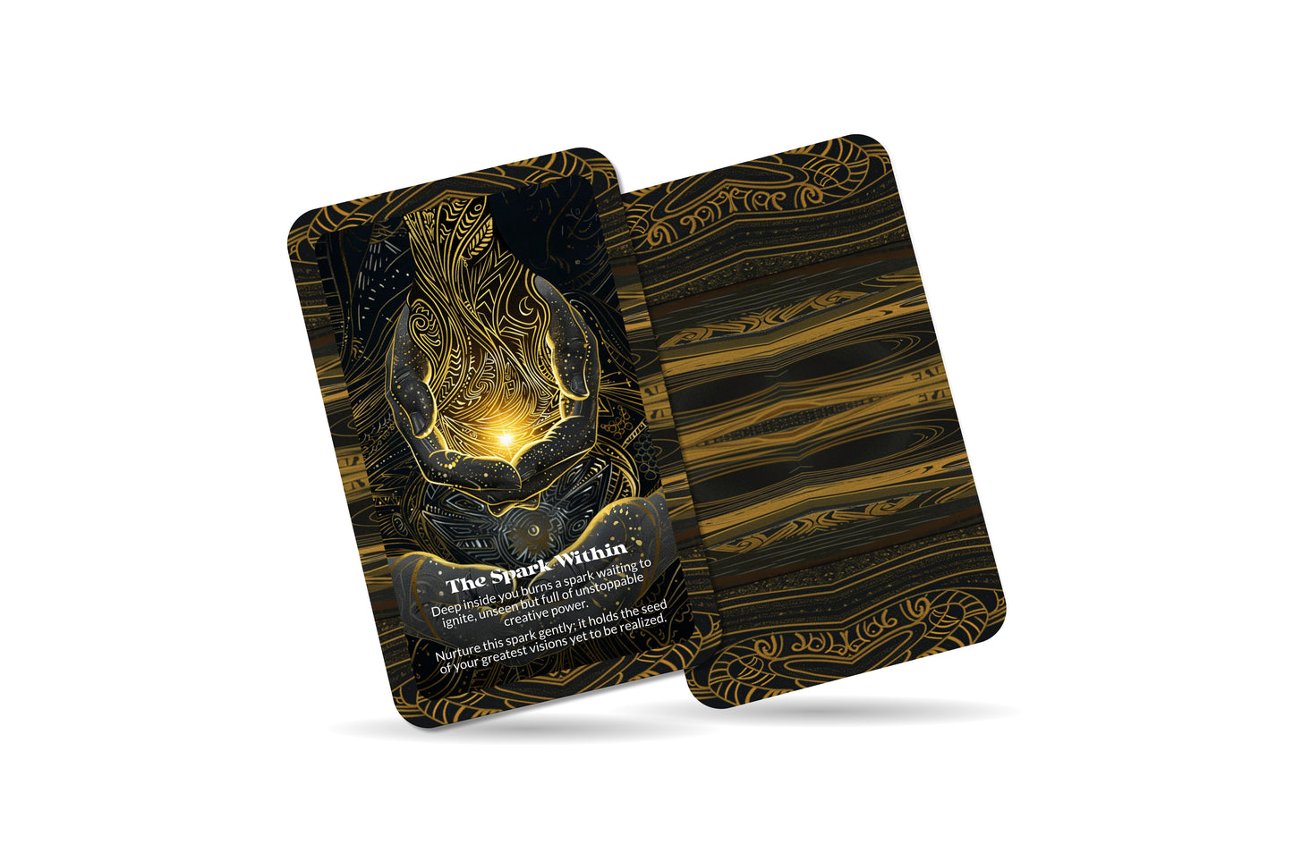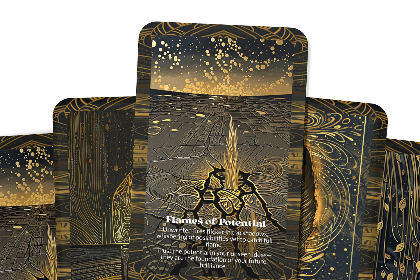 “Unwritten Fires – Igniting Your Vision” - Unwritten Fires represents the spark of inspiration that has yet to fully manifest but is burning bright within you. This card is a call to ignite your inner vision and allow it to blaze into existence. The “unwritten” aspect speaks to the possibilities that are waiting to be written into your life story—untouched, yet full of potential. This card urges you to follow the fire within and trust in your ability to bring your visions to life. Unwritten Fires encourages you to take action toward your dreams, even if they are still taking shape. The warmth and light from this fire will guide you, showing you the way toward a future you have yet to create. The time to act is now—let your vision ignite and light your path forward.